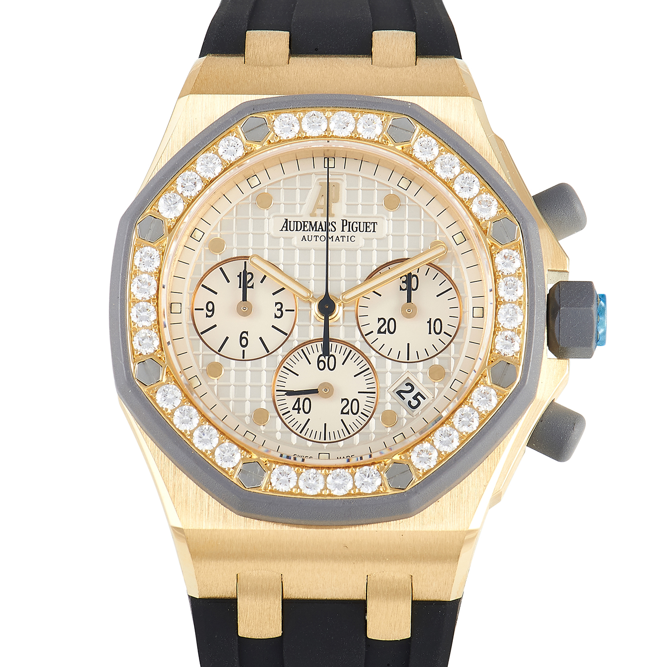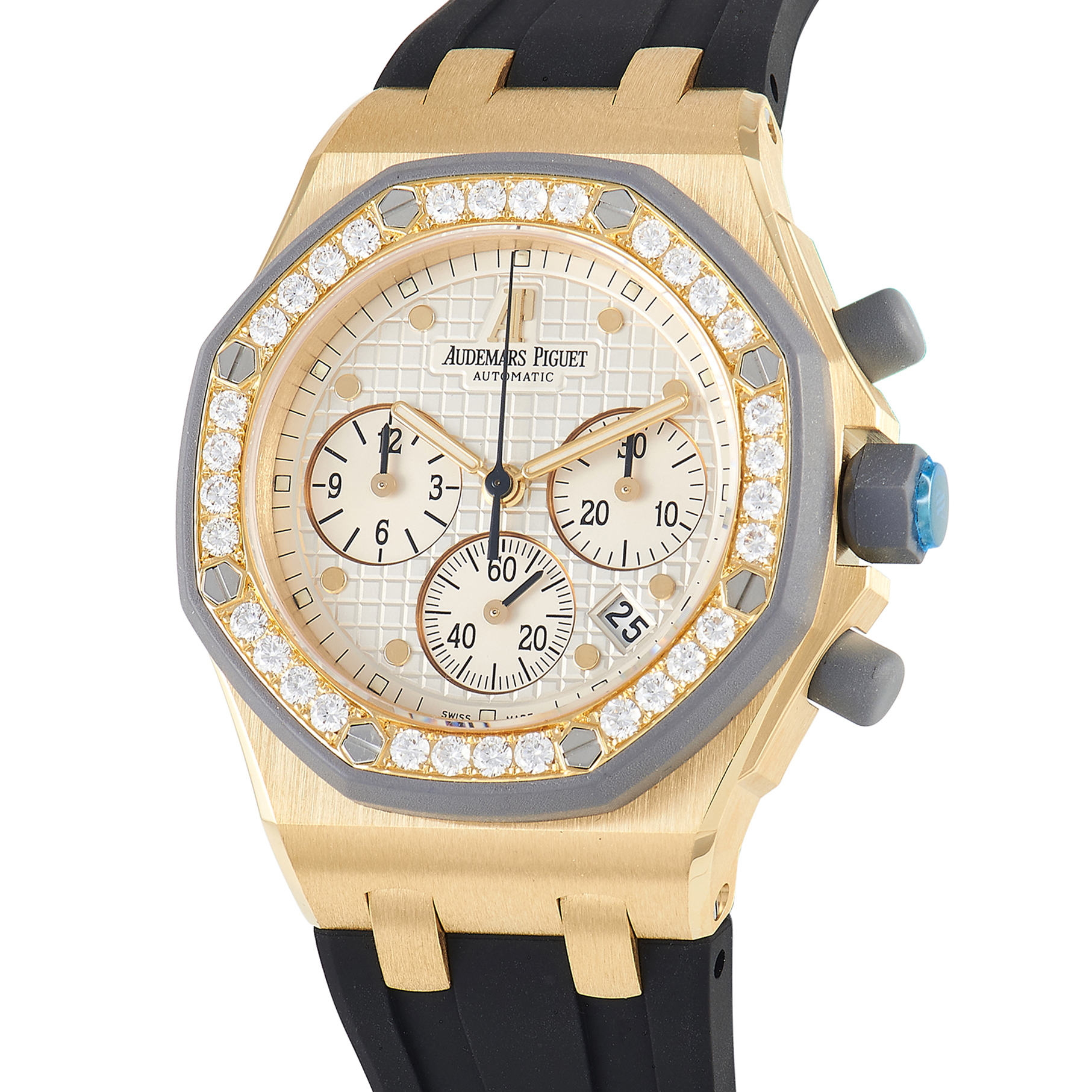 This Audemars Piguet Royal Oak Offshore Chronograph Diamond Ladies Watch 25986AK.ZZ.D003CA.02 is offered in pre-owned condition inclusive of the service papers.