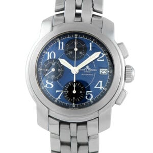A gift box accompanies this pre-owned Baume & Mercier Capeland Chronograph Steel Watch MVO45216.