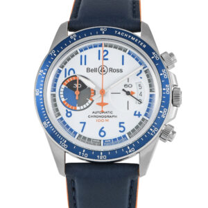 The Bell & Ross BRV2-94 Racing Bird is a 41mm steel chronograph with a retro colorway. It has a distinctive white dial detailed with blue Arabic numeral hour markers, luminous hour and minute hands, and an orange central chrono seconds hand. The segmented and tri-colored sub-dial at 9 is the 30-minute counter, while at 3 o’clock is the small seconds and date sub-dial. Surrounding the watch’s face is a minute track with five-minute segments alternating blue and gray. A blue aluminum insert on the fixed steel bezel further frames the watch’s colorful yet legible face. Visible from the sapphire case back is the 4Hz automatic-winding BR-CAL.301 that powers the watch. This model is rated water-resistant to 100m and was released in a limited edition of 999 pieces.