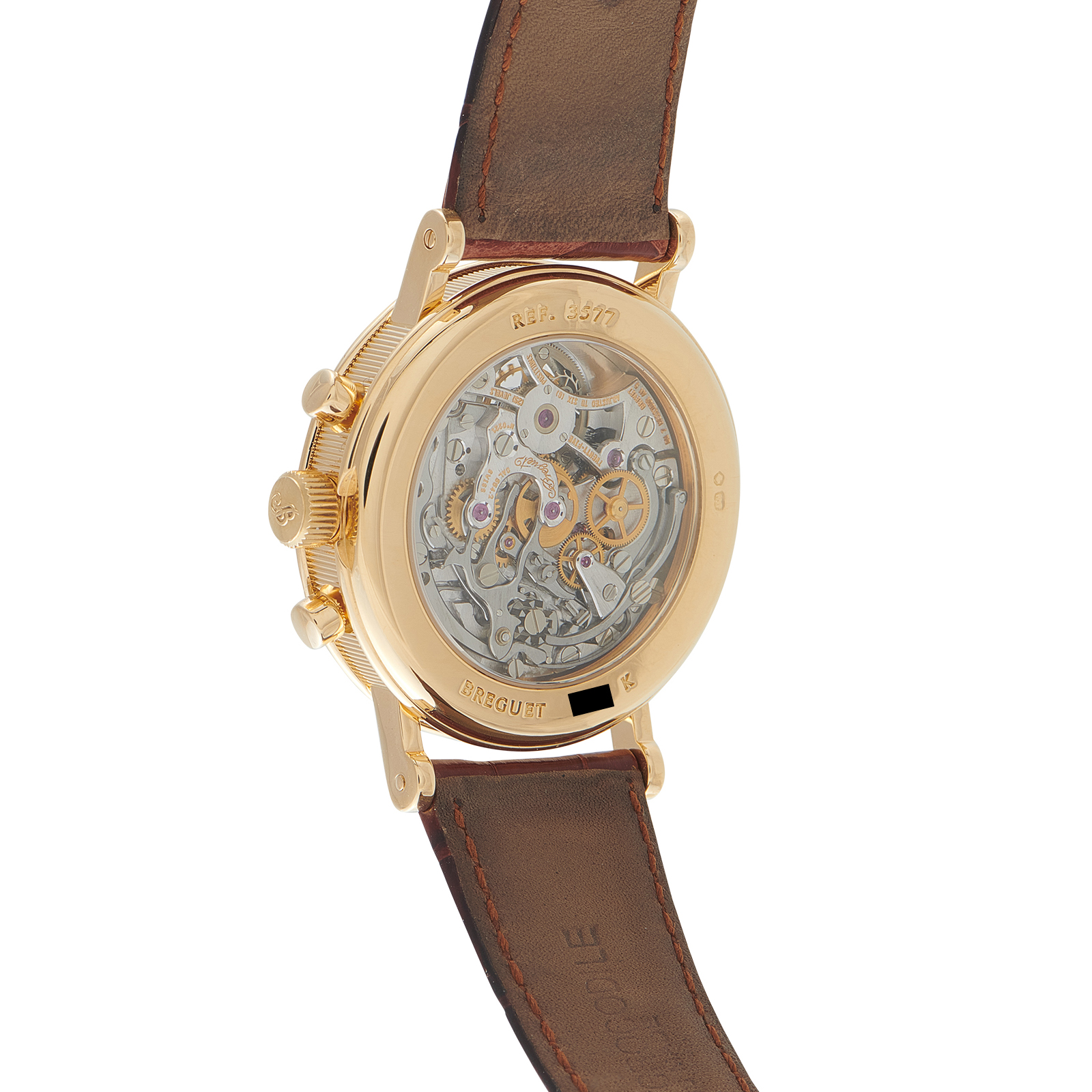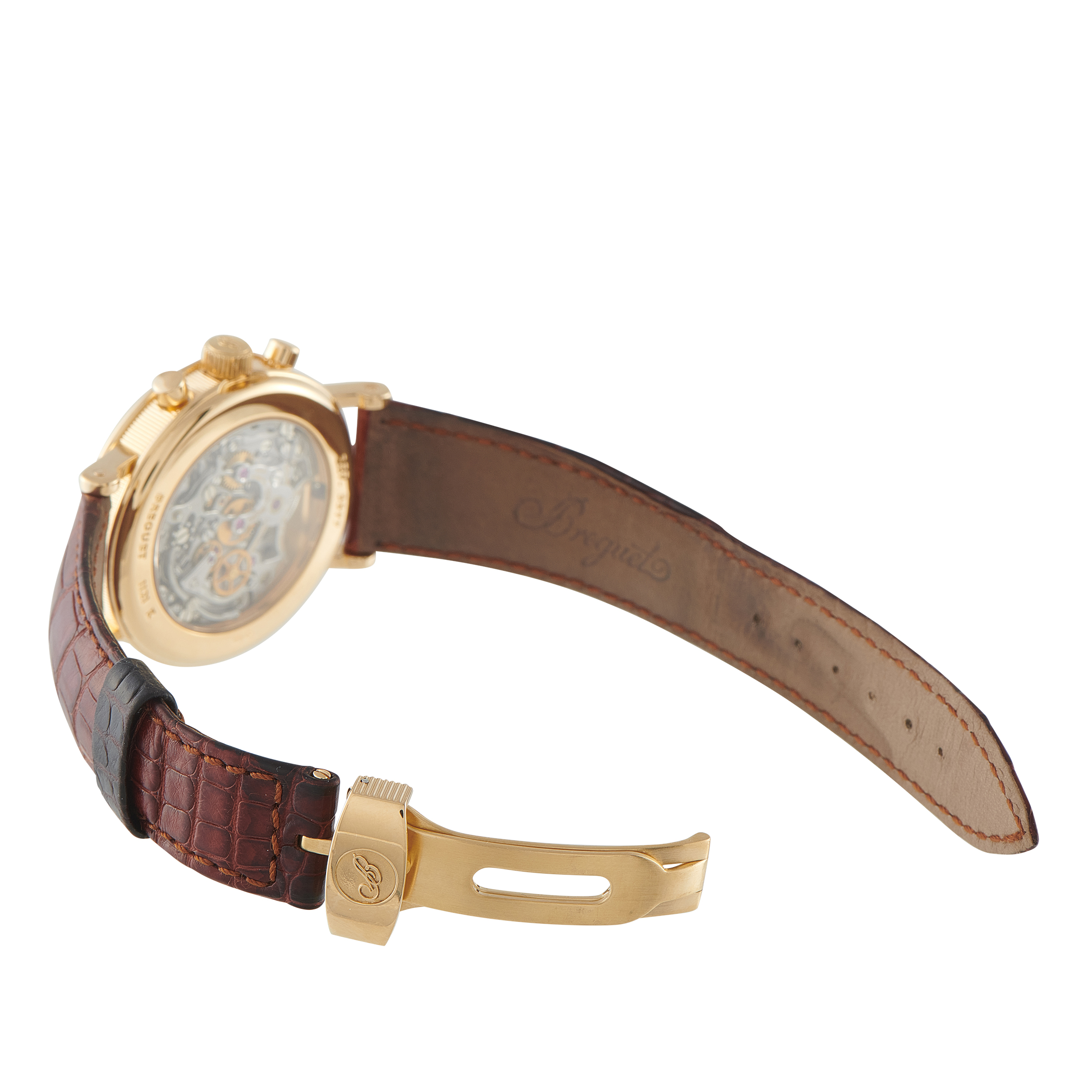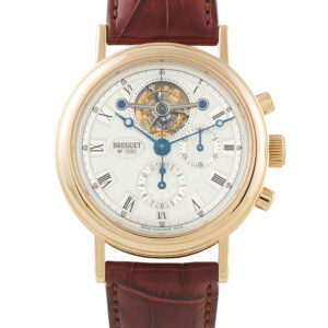 Papers, a leather booklet, and a gift box accompany this pre-owned Breguet Classique Complications Tourbillon Chronograph 18K Yellow Gold Watch 3577ba/15/9v6.