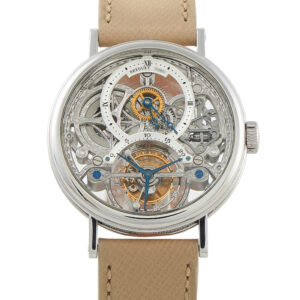 A timepiece first conceptualized by Abraham-Louis Breguet in the early 1800s, this skeletonized watch includes a 36mm Platinum case and a chic beige leather strap. Every component of the skeletonized movement is beautifully hand engraved and allows the tourbillon to be viewed from virtually any angle. It features offset hour and minute dials, including an arched counter at the 6-o-clock position and a three prong second hand in the brand’s signature blue color. It’s powered by a manual-wind 558 SQ1 movement with 50 hours of power reserve and is water resistant up to 30 meters.
