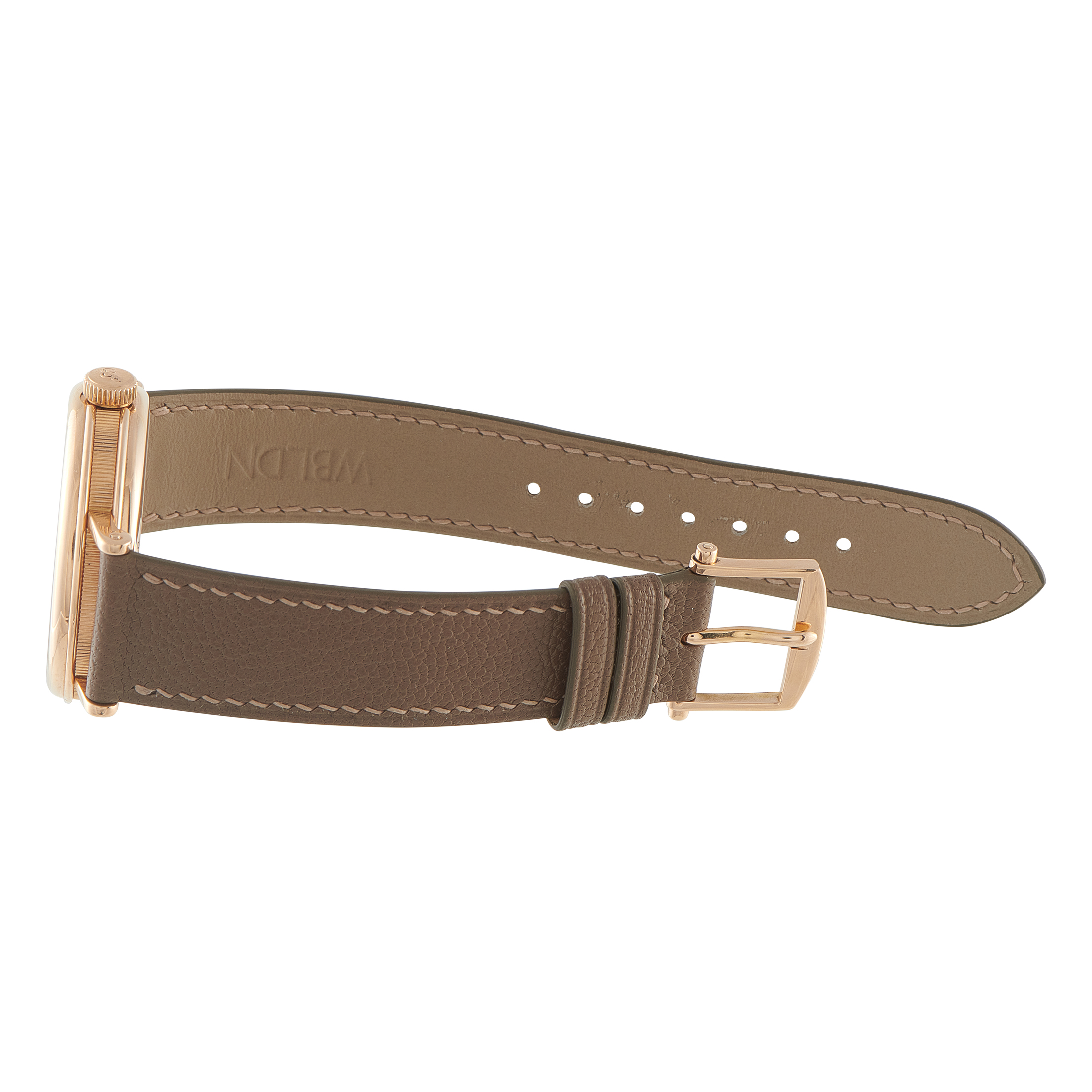 This watch comes complete with a 36mm case crafted from 18K rose gold and a leather strap. An engraved skeletonized mechanical movement allows the tourbillon to be viewed from all angles. Along with an open-worked dial featuring hand-made ‘filet sauté’ guilloché decoration, it includes a twenty second arched counter at the 6-o-clock position and a three prong second hand attached to the one minute tourbillon cage. It’s powered by a manual-wind 558 SQ1 movement with 50 hours of reserve time and is water resistant up to 30 meters.