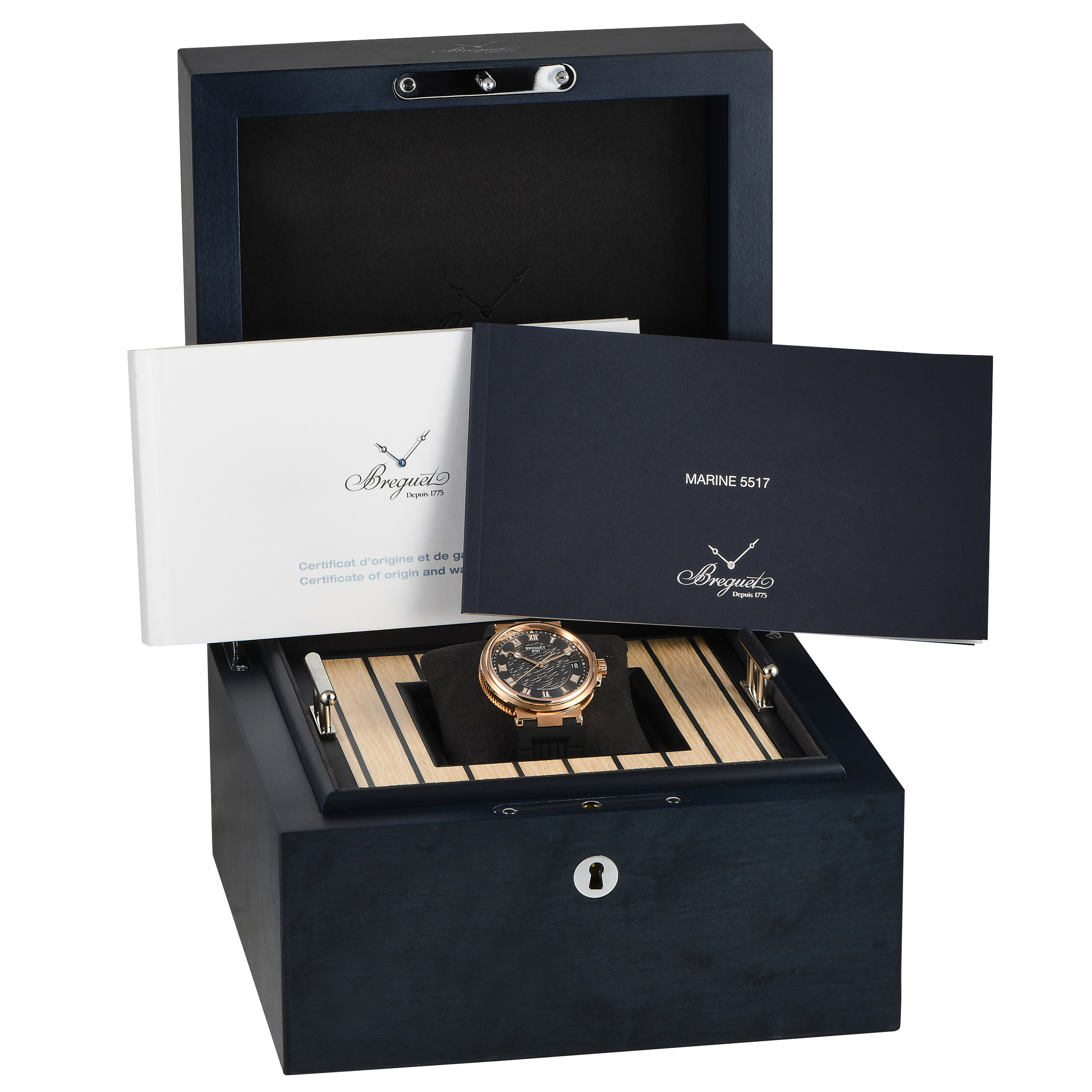 This is an unworn Breguet Marine Automatic 18K Rose Gold Watch 5517BR/G3/5ZU. It comes with papers and the manufacturer’s box.