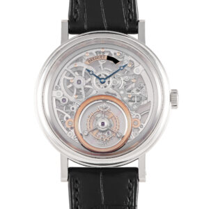 A fascinating timepiece from Breguet’s Classique line from 2007. The Tourbillon Messidor 5335Pt/42/9W6 highlights Breguet’s innovative instincts with its uncluttered tourbillon design on a finely detailed and meticulously finished skeletonized dial. This watch pays tribute to the brand’s tourbillon invention which was patented on 7 Messidor Year IX (June 26, 1801). The watch features a 40mm platinum case with off-centered hours and minutes and blued Breguet hands set on the upper half of the dial while at the lower half is the rose gold tourbillon cage with its separate sapphire crystal. The watch is driven by Caliber 558 SQ2, a handwound movement with 201 components, 25 jewels, and 50 hours of power reserve. The watch is outfitted with a leather strap.