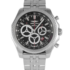 This bold timepiece features a 49mm Stainless Steel case and a Stainless Steel bidirectional rotating bezel. The black dial comes complete with luminescent Stainless Steel hands, a date dial between the 4-o-clock and 5-o-clock position, and a trio of white steering-wheel motif chronograph sub-dials. It’s powered by an automatic Breitling Calibre 25 movement with 42 hours of reserve time and is water resistant up to 100 meters.