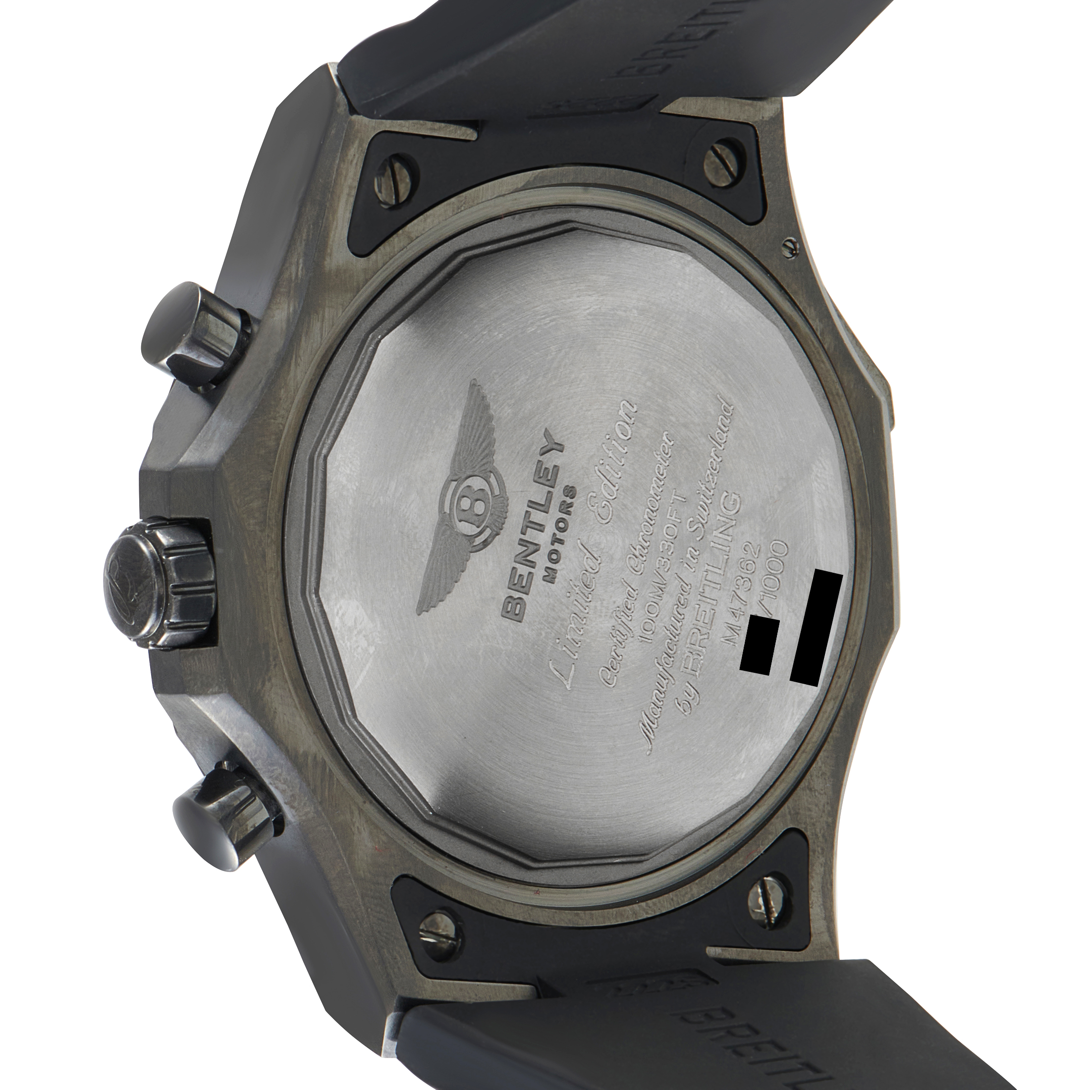 This pre-owned Breitling Bentley GMT Midnight Carbon PVD Steel Watch M47362 comes with papers and a gift box.