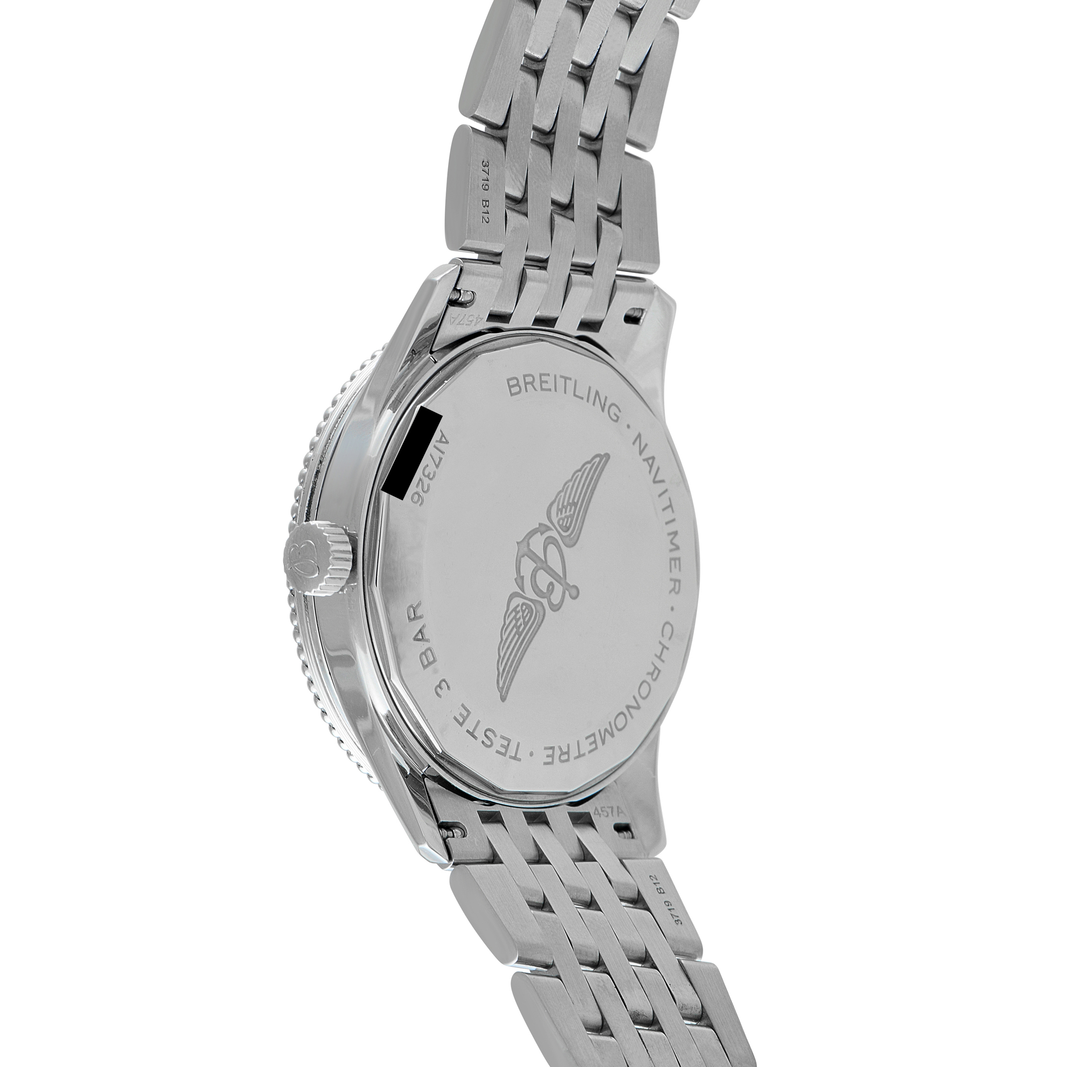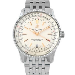 The 41mm all-steel Breitling Navitimer ref. A17326 is quietly striking, with a silver dial enlivened by rose gold hands and index markers. Its three-hand layout and date display at 6 o’clock keep the design clean, while a minute track maintains classic functionality. The beaded, bidirectional slide-rule bezel nods to Navitimer heritage, adding texture and purpose without overwhelming the minimalist aesthetic. Powered by the COSC-certified Breitling Caliber 17 movement, it provides a 38-hour power reserve and is water-resistant up to 30 meters.