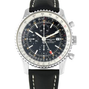 This is a pre-owned Breitling Navitimer World Chronograph GMT Steel Watch A2432212/B726. It is accompanied by papers, leather watch travel case, and the manufacturer’s box.