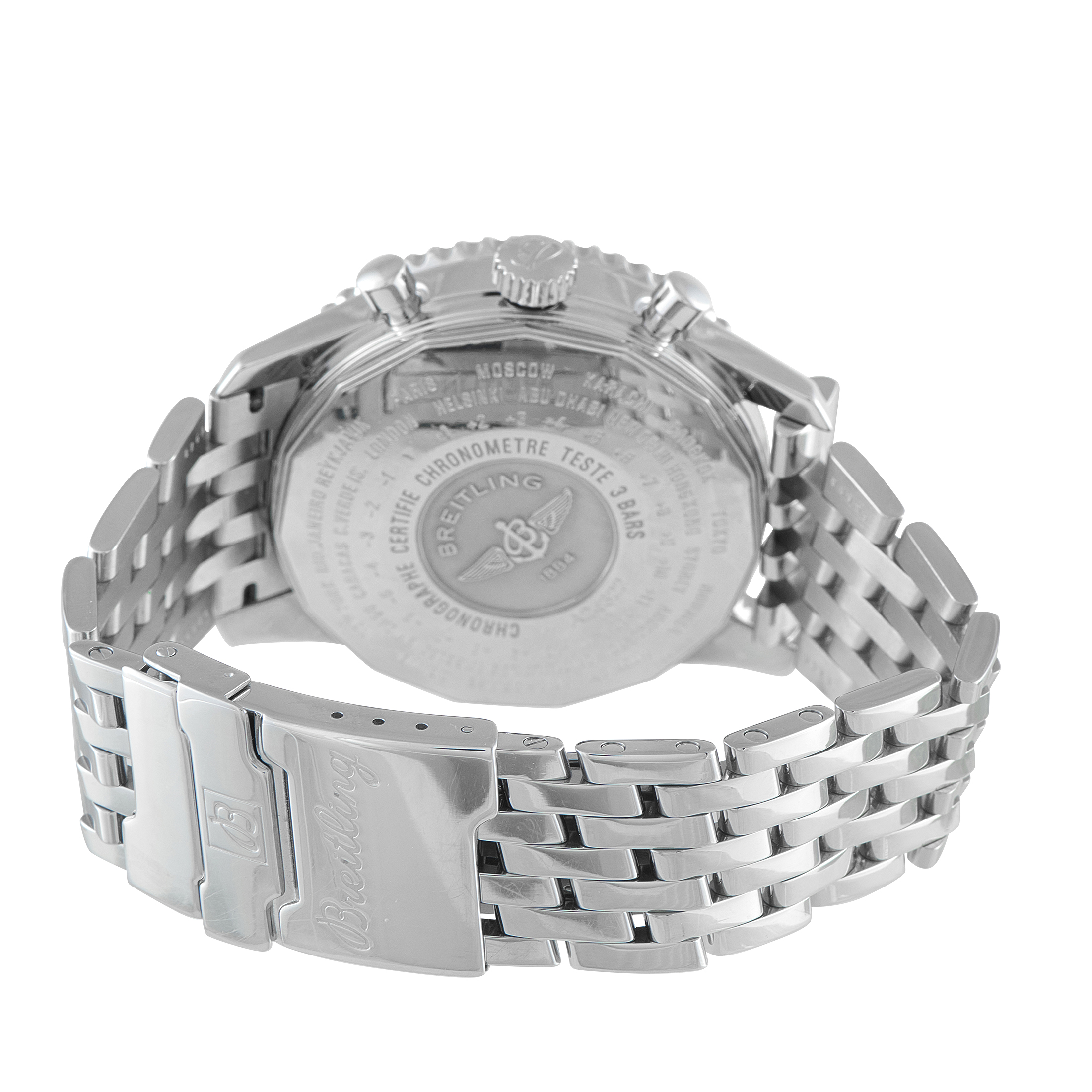Despite its larger footprint, the watch stays visually tidy through its polished detailing. A solid caseback engraved with world city names houses the COSC-certified Breitling Caliber 24.