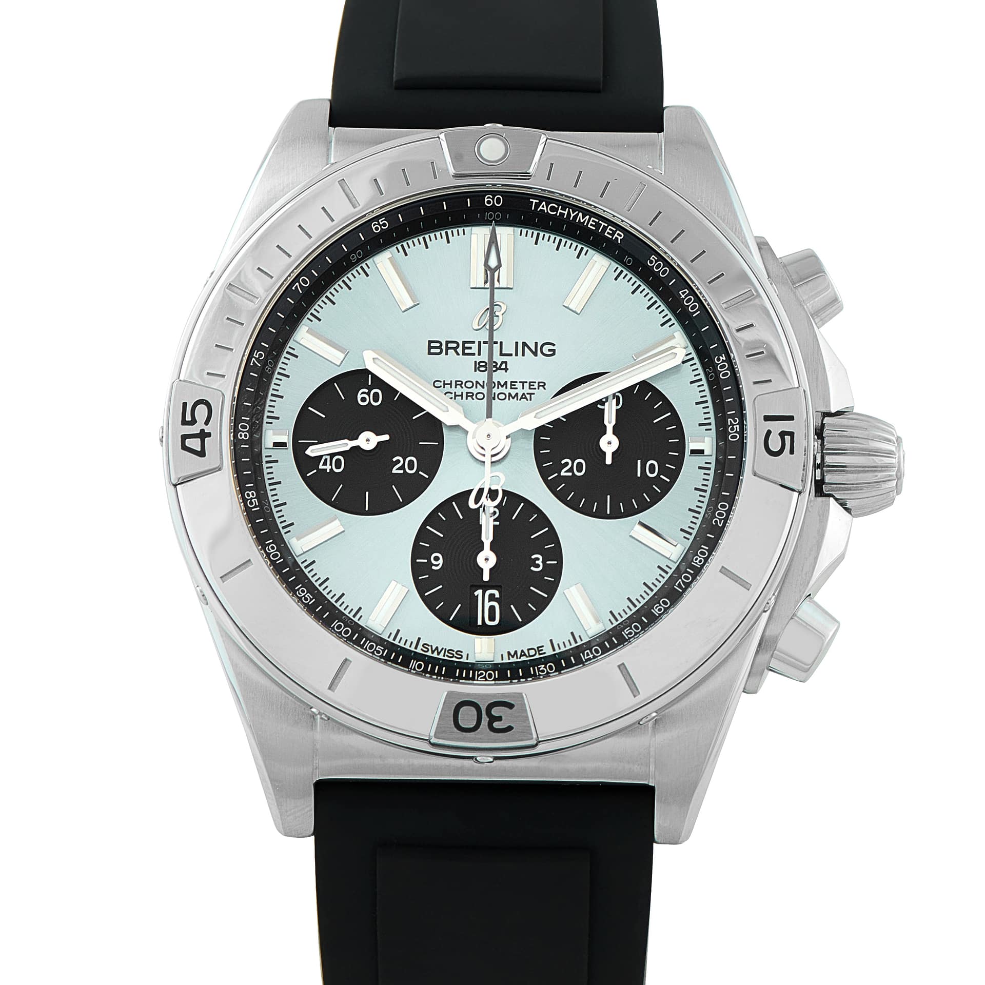This is a pre-owned Breitling Chronomat B01 42 Ice Blue Dial Steel and Platinum Watch PB0134101C1S2. It comes complete with papers and the manufacturer’s box.