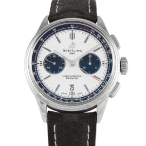 A vintage-inspired chronograph that looks even better over time. The Breitling Premier 01 Chronograph features a 42mm-wide, 13.65mm-thick case in stainless steel, complemented by a leather strap and a silvery white panda dial. On the dial are shiny hands, index hour markers, a date window at 6:00, and two sub-dials. Inside the watch is Caliber 01 self-winding mechanical movement operating at 4Hz with 41 jewels and 70 hours of power reserve.