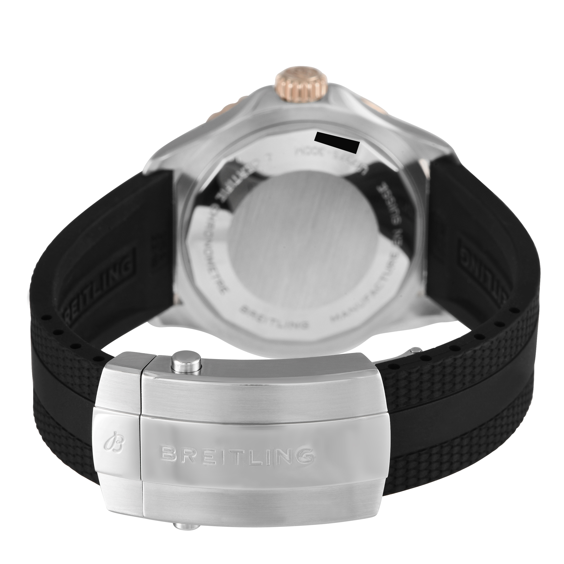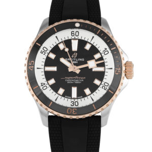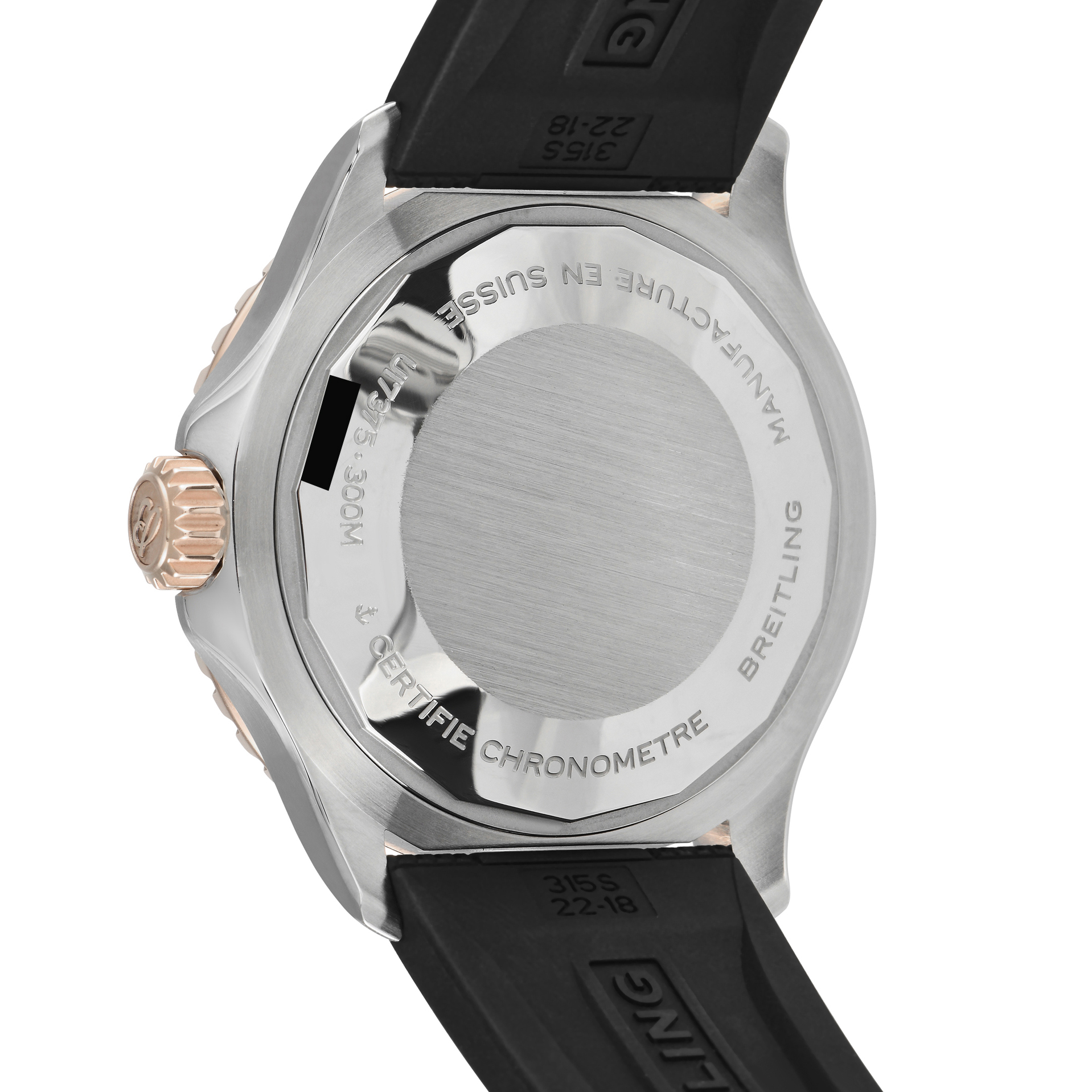 This impeccably crafted watch features a 42mm case made from 18K Rose Gold with a durable black rubber strap – this pairing is also complemented by the uni-directional rotating bezel, which pairs 18K Rose Gold with a black ceramic inlay. The black dial features luminous rose gold toned hands, luminous index markers, and minute markers around the outer edge, all which are highly legible even when underwater. It’s powered by an automatic Breitling 17 movement with approximately 38 hours of reserve time. An impressive water resistance of up to 300 meters makes it ideal for surfing, swimming, diving, or anything else on your agenda.