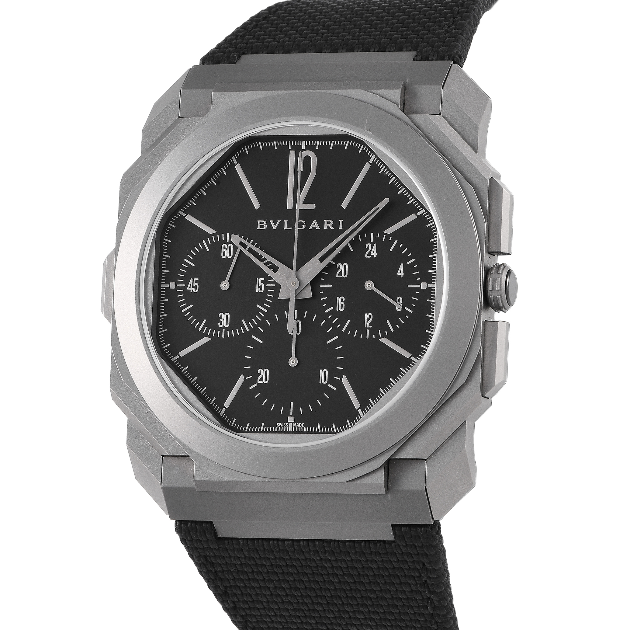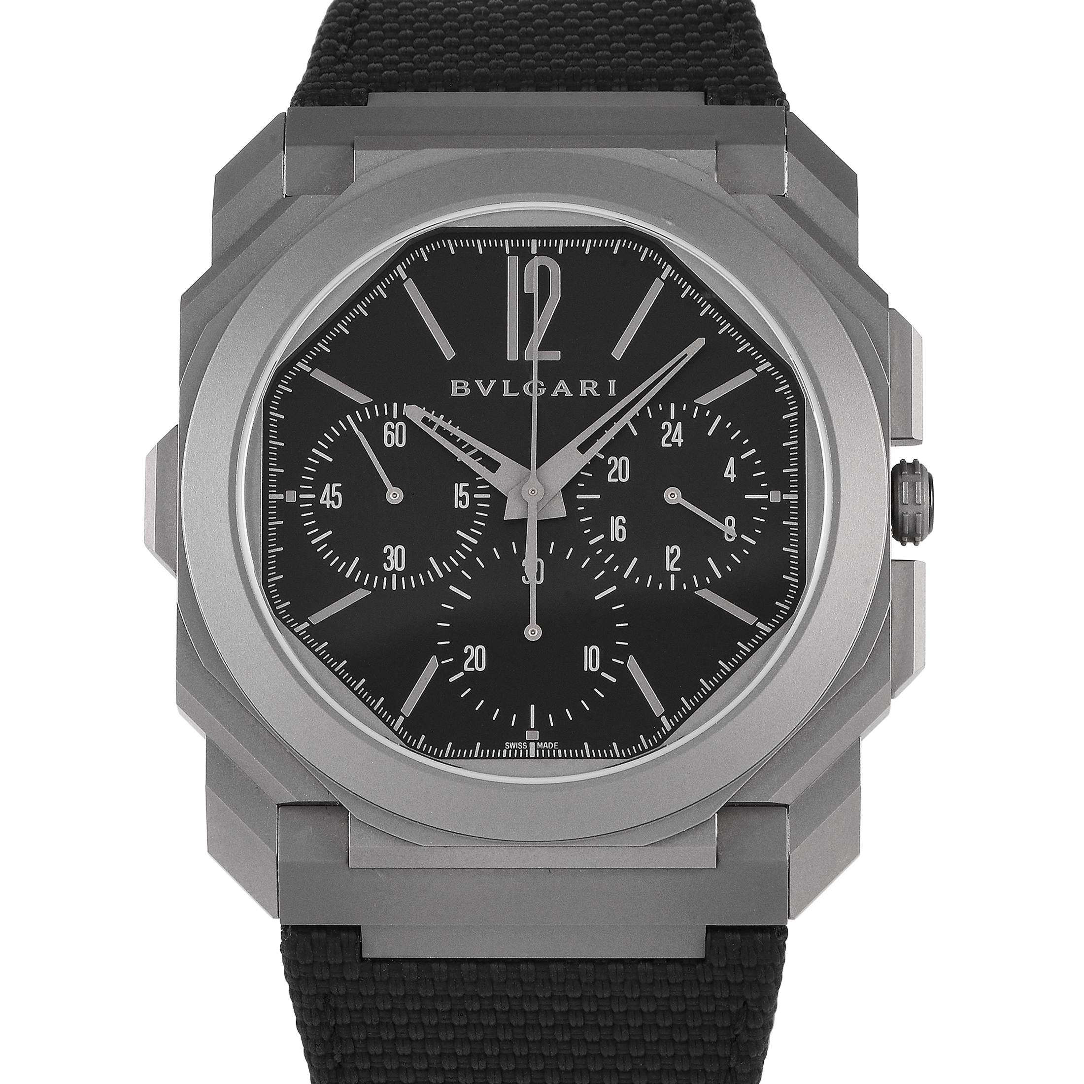 This pre-owned Bvlgari Octo Finissimo Titanium GMT Chronograph Watch 103673 comes with papers and the manufacturer’s box.