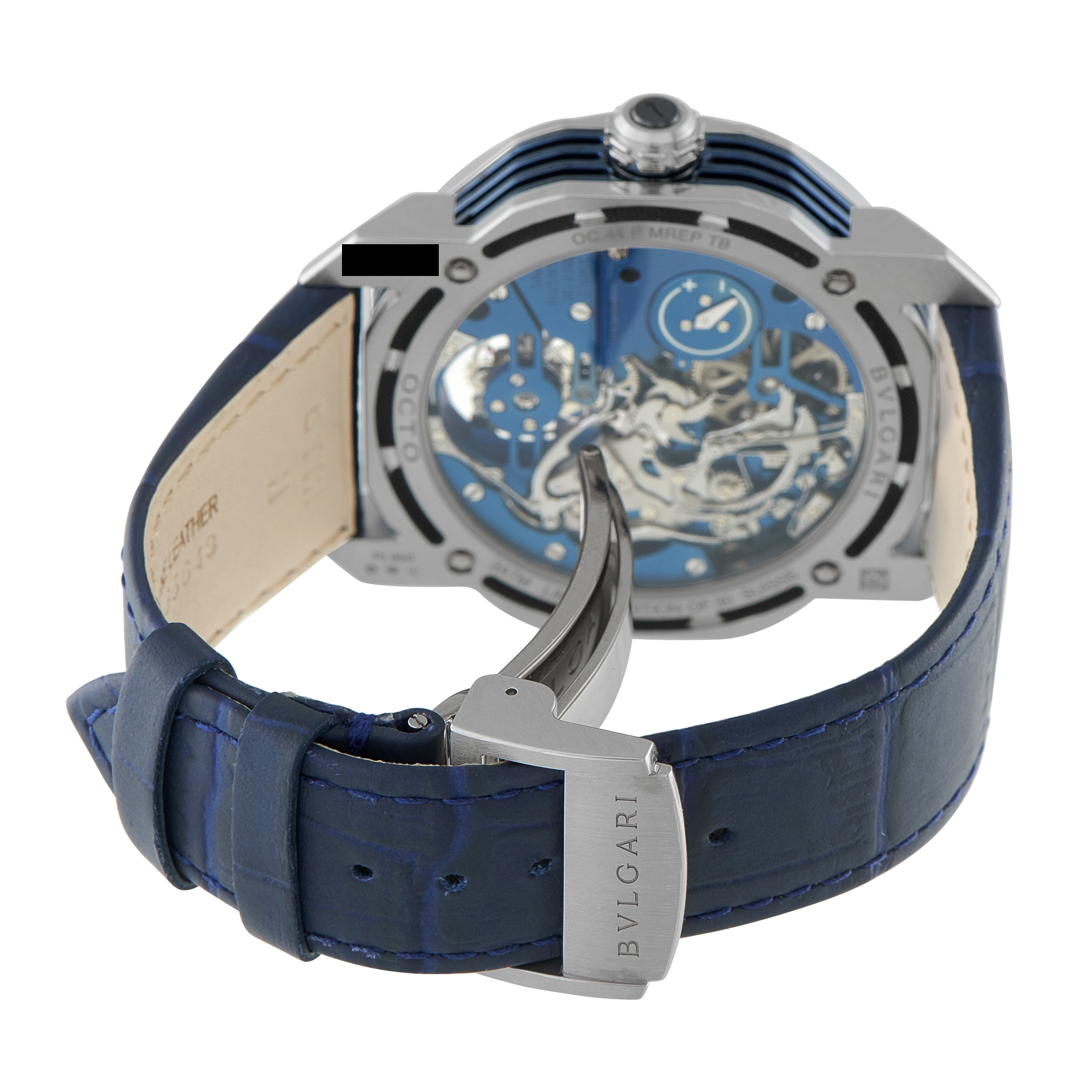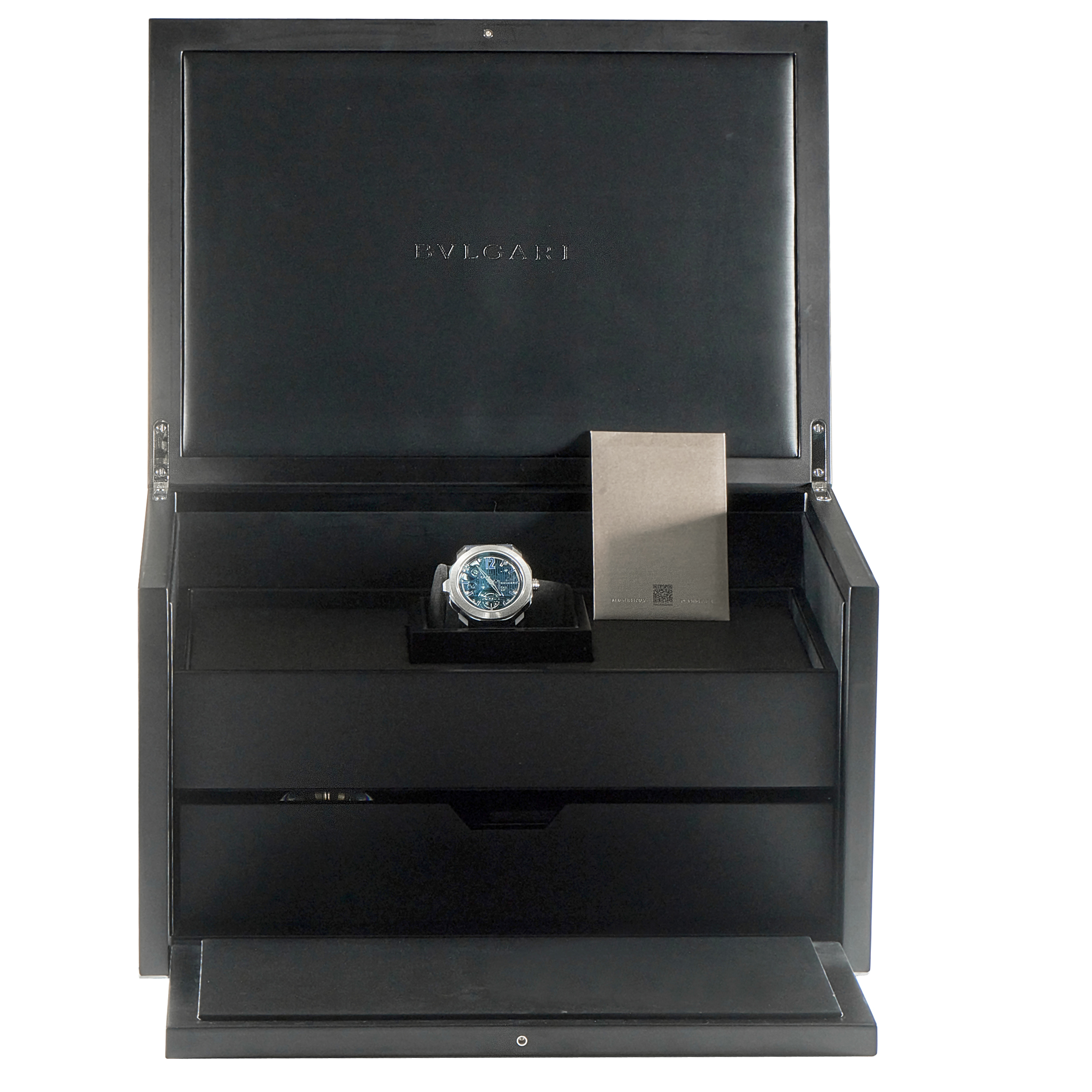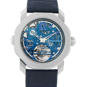 This pre-owned Bvlgari Octo Roma Blue Carillon Tourbillon Limited Edition Watch 103627 is accompanied by papers and the manufacturer’s box.