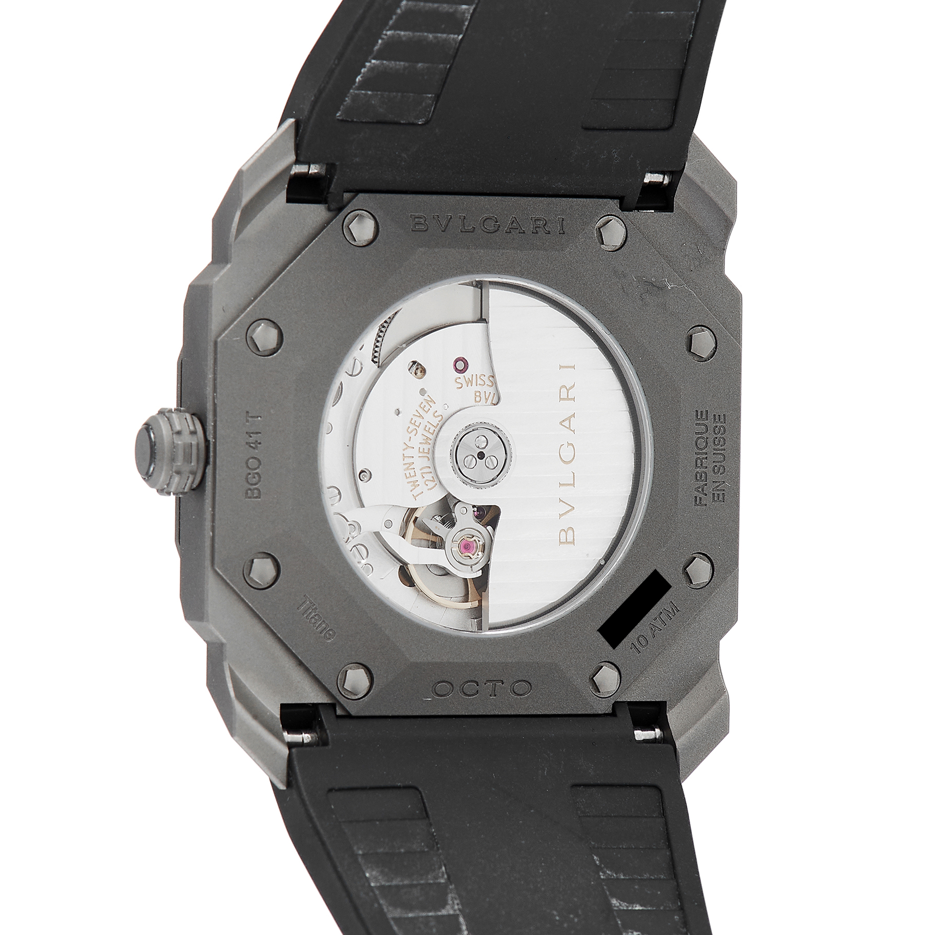 A timepiece designed with character, strength, and elegance in mind. The Bvlgari Octo Solotempo L’Originale Grey Titanium Watch 102858 features a titanium case in a fascinating matte finish, a titanium crown, and a titanium dial with applied hour markers and a discreet 3 o’clock date aperture. It is powered by Caliber L 191 Solotempo, a mechanical self-winding movement with hour, minute, seconds, and date functions, and a 42-hour power reserve. The movement, adorned with Côtes de Genève motif, is visible through the sapphire crystal caseback. Securing the watch to the wrist is an integrated black rubber strap with a tang clasp.