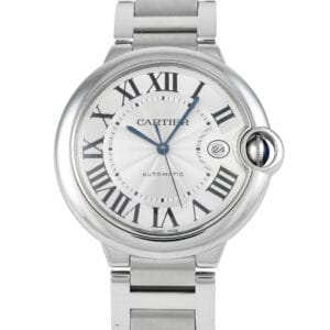 The manufacturer’s box accompanies this pre-owned Cartier Ballon Bleu Watch W69012Z4.