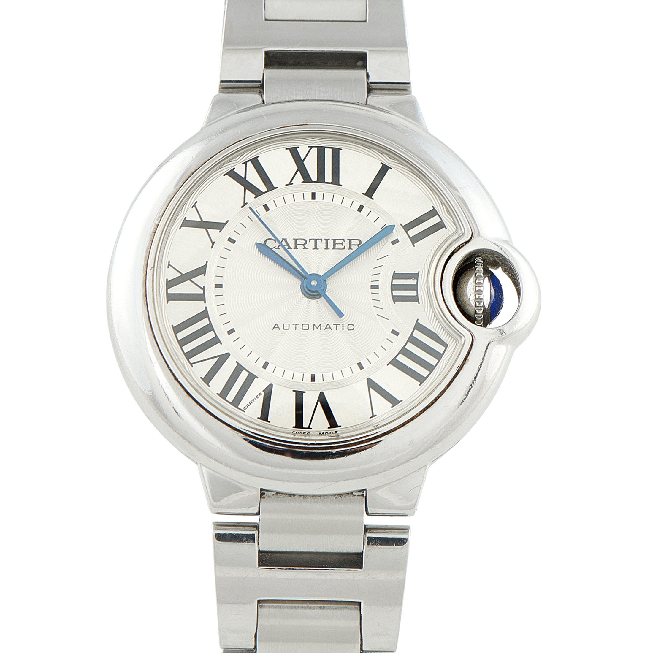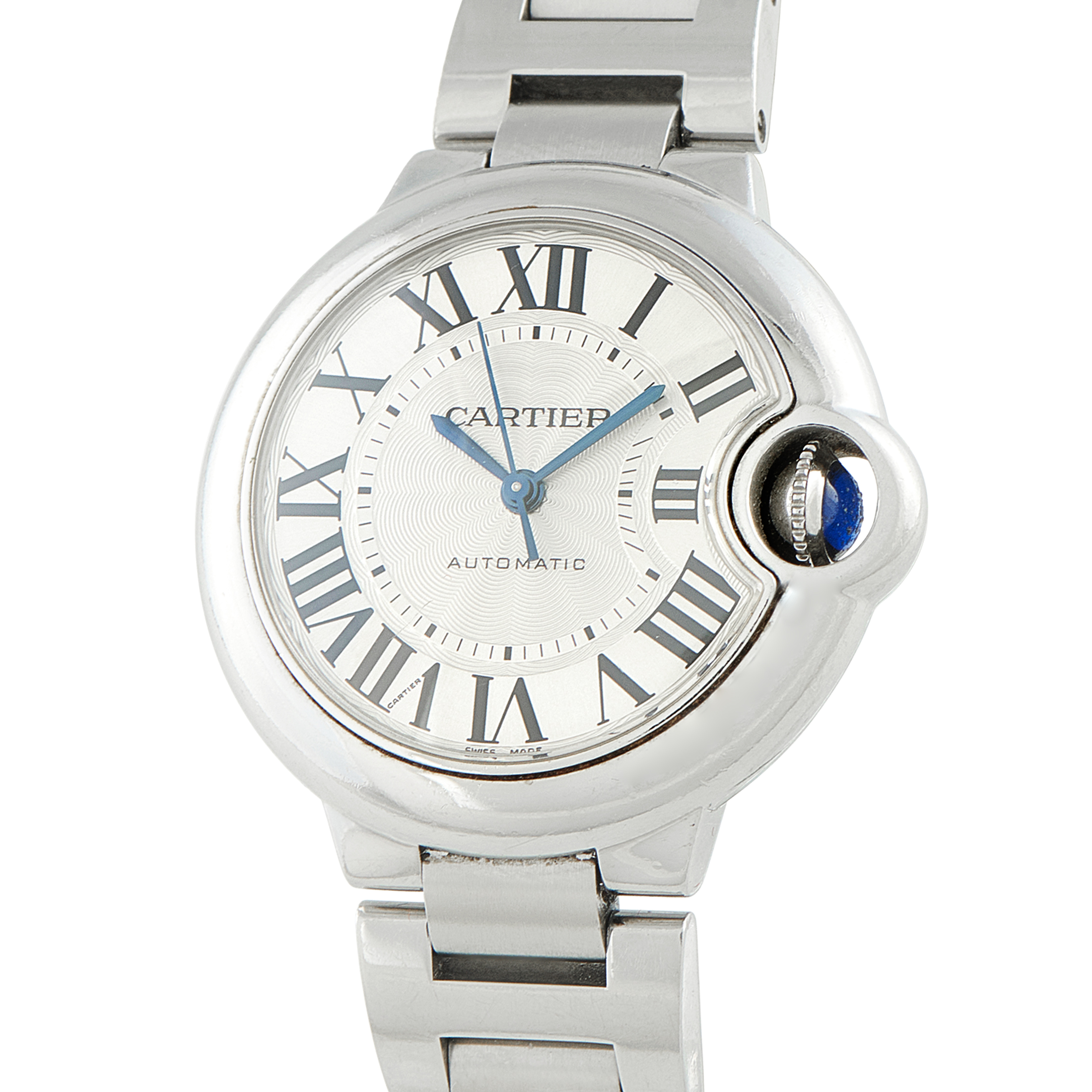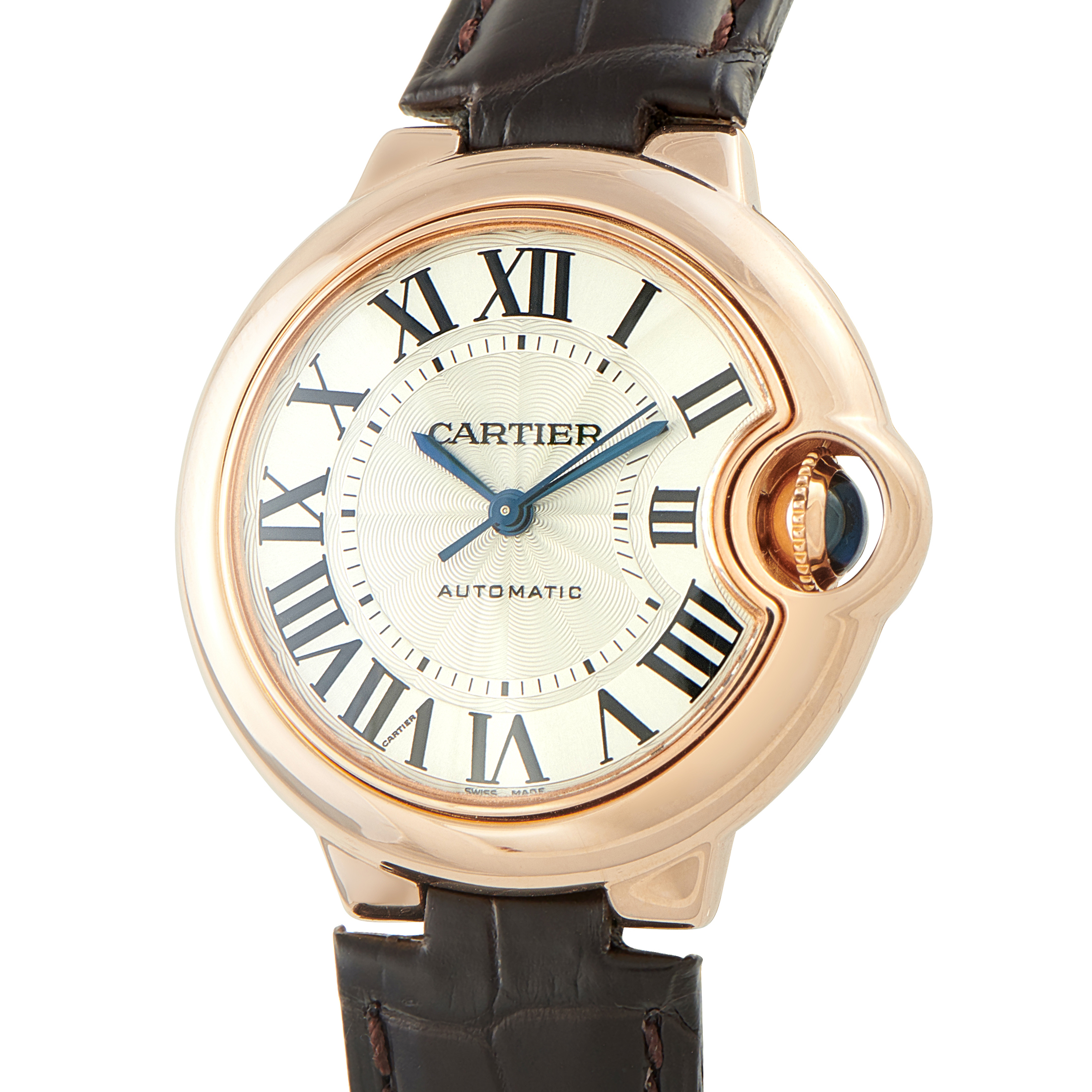 The Ballon Bleu de Cartier ref. WE902055 channels Cartier’s signature elegance with a lighthearted twist. Its 40mm round case, inspired by a balloon, is crafted in 18K rose gold and framed by a diamond-set bezel. The silver guilloché opaline dial is punctuated by blued steel hands and black Roman numerals. The watch is driven by the manual-winding Caliber 430 MC, delivering approximately 40 hours of precise performance. A brown leather strap completes the look, offering comfort and refinement on the wrist.
