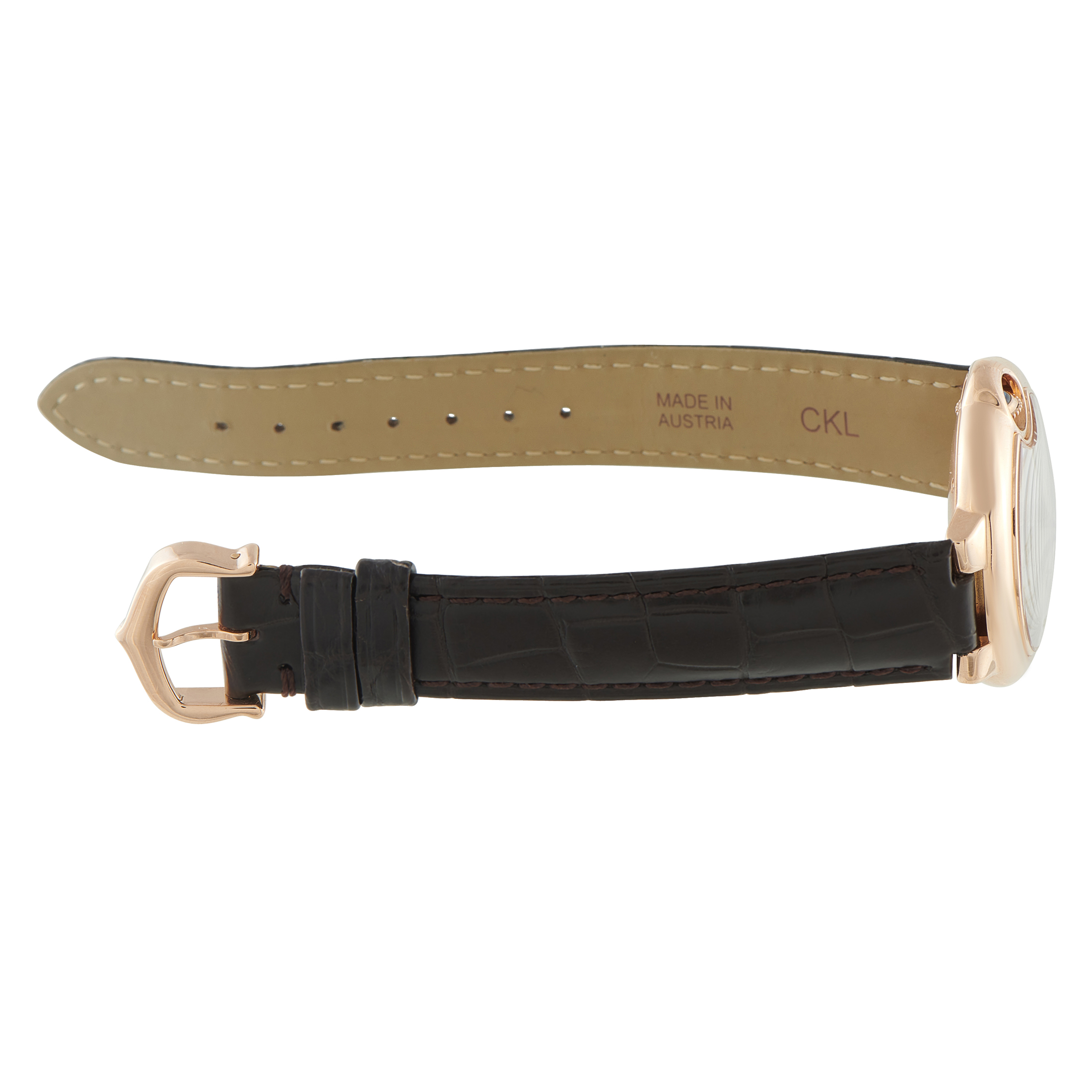 Made from rose gold, this Ballon Bleu watch demonstrates Cartier’s impeccable watchmaking skills. Its 33mm case boasts a pebble-like convex profile with a fluited crown set with a blue sapphire cabochon. The silvered guilloché dial is detailed with sweeping Roman numerals and the contrasting blued-steel sword-shaped hands. This compact time-only watch is powered by a self-winding movement, Caliber 1853, offering approximately 37 hours of power reserve.