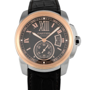 Papers and the manufacturer’s box accompany this pre-owned Cartier Calibre de Cartier Automatic Steel and Rose Gold Men’s Watch W71000S1.