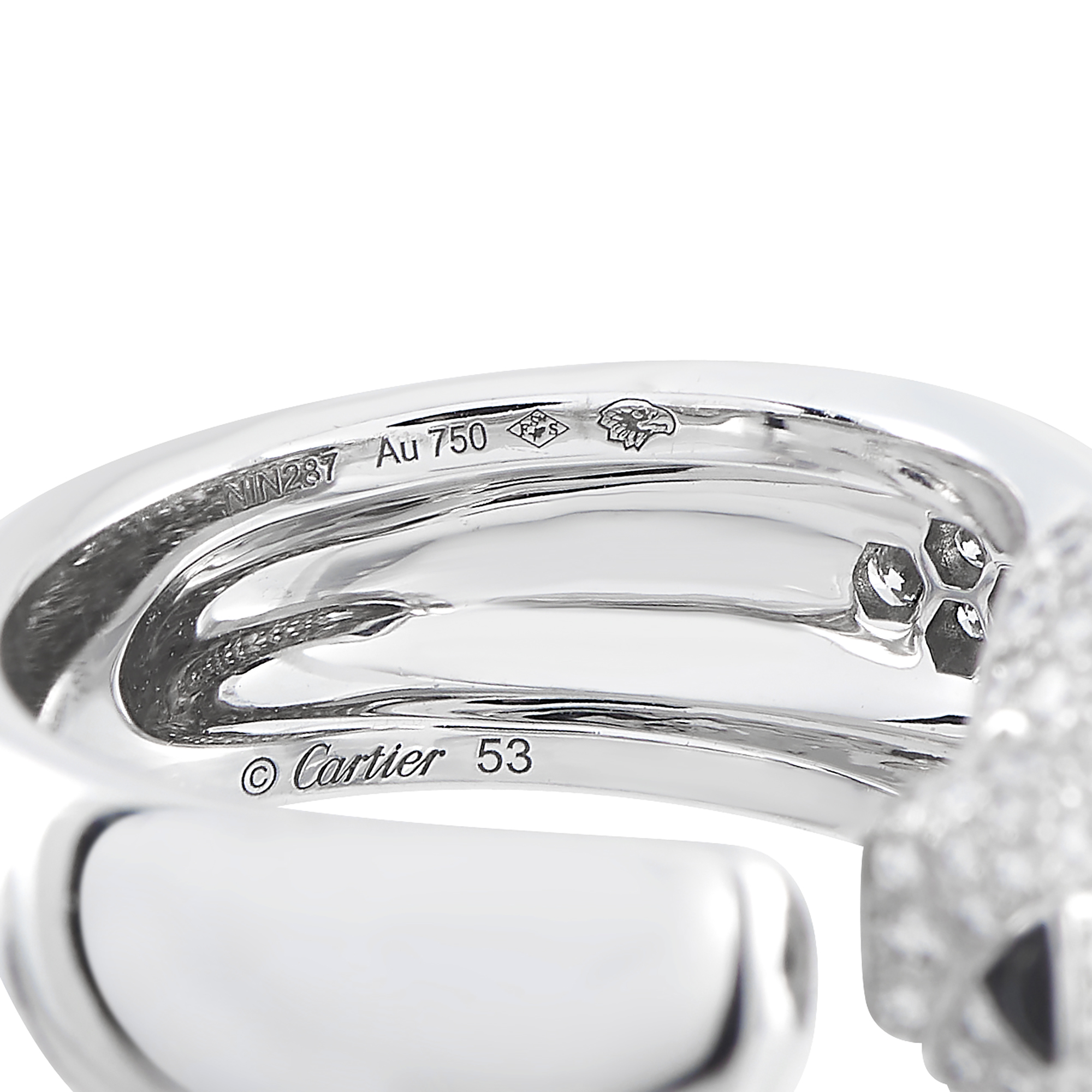 This Cartier Panthère 18K White Gold 1.15 ct Diamond, Emerald and Onyx Ring is offered in estate condition. It comes with the manufacturer’s box.
