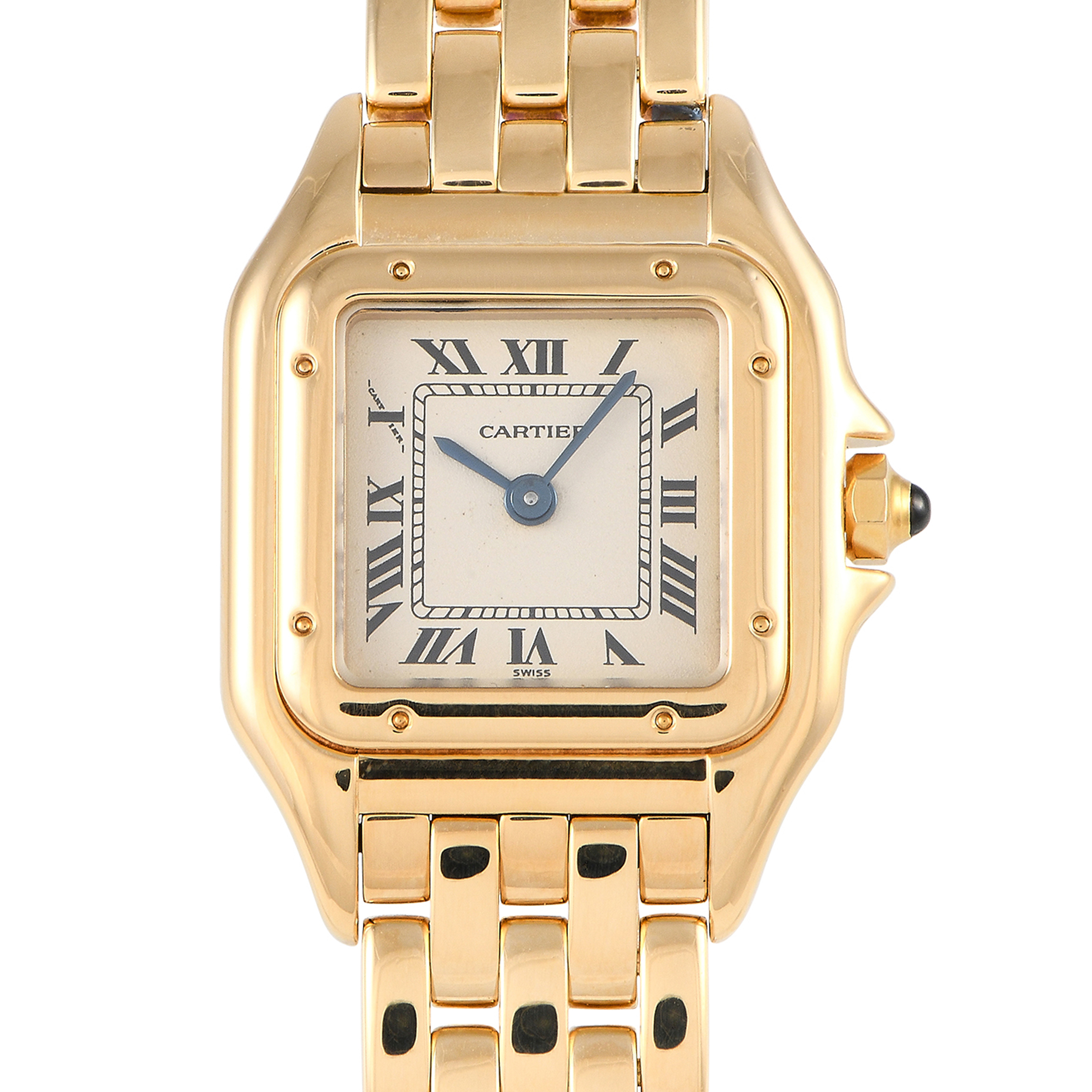 The Panthère de Cartier lady’s wristwatch clearly evokes feminine grace. This quartz timepiece features a 22mm x 30mm case in 18K yellow gold, with a square bezel secured by eight screws. Its cream dial has an inner minute track framed by black Roman numeral hour markers. Blued steel sword-shaped hands point to the hour and minute. The watch has a six-sided crown set with a blue sapphire cabochon. The watch is fitted with a flexible yellow-gold link bracelet patterned after the sinuous movement of a panther.