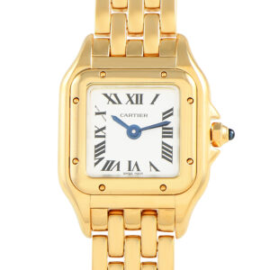 This is an unworn Cartier Panthère Mini 18K Yellow Gold Quartz Ladies Watch WGPN0048. It comes complete with papers and the manufacturer’s box.