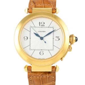 The Cartier Pasha 42 mm Watch, reference number W3018651, is a part of the Pasha De Cartier collection. The watch comes with an 18K Yellow Gold case measuring 42 mm in diameter and is presented on a Brown Leather Band with a deployment Clasp. This model is equipped with automatic movement. The white dial features Diamond-shaped hands, radial stick dial markers, and Arabic numerals at the the 3, 6, 9 and 12 o’clock positions. The dial displays hours, minutes, and seconds with a fixed 18K Yellow Gold Bezel . The watch is water-resistant to 100 meters.
