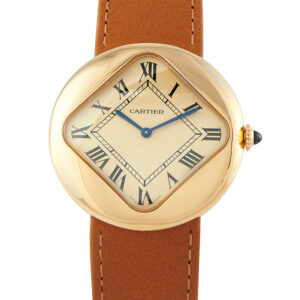 Proof that even a pebble can leave a mark, the Cartier Pebble ref. CRWGPB0003 revives the unconventional watch created by Cartier London in 1972. Its 18k yellow gold circular case features a flattened cushion outline, framing an eggshell-colored dial. Roman numerals, a railroad minute track, and blued steel hands maintain the brand’s established design language.