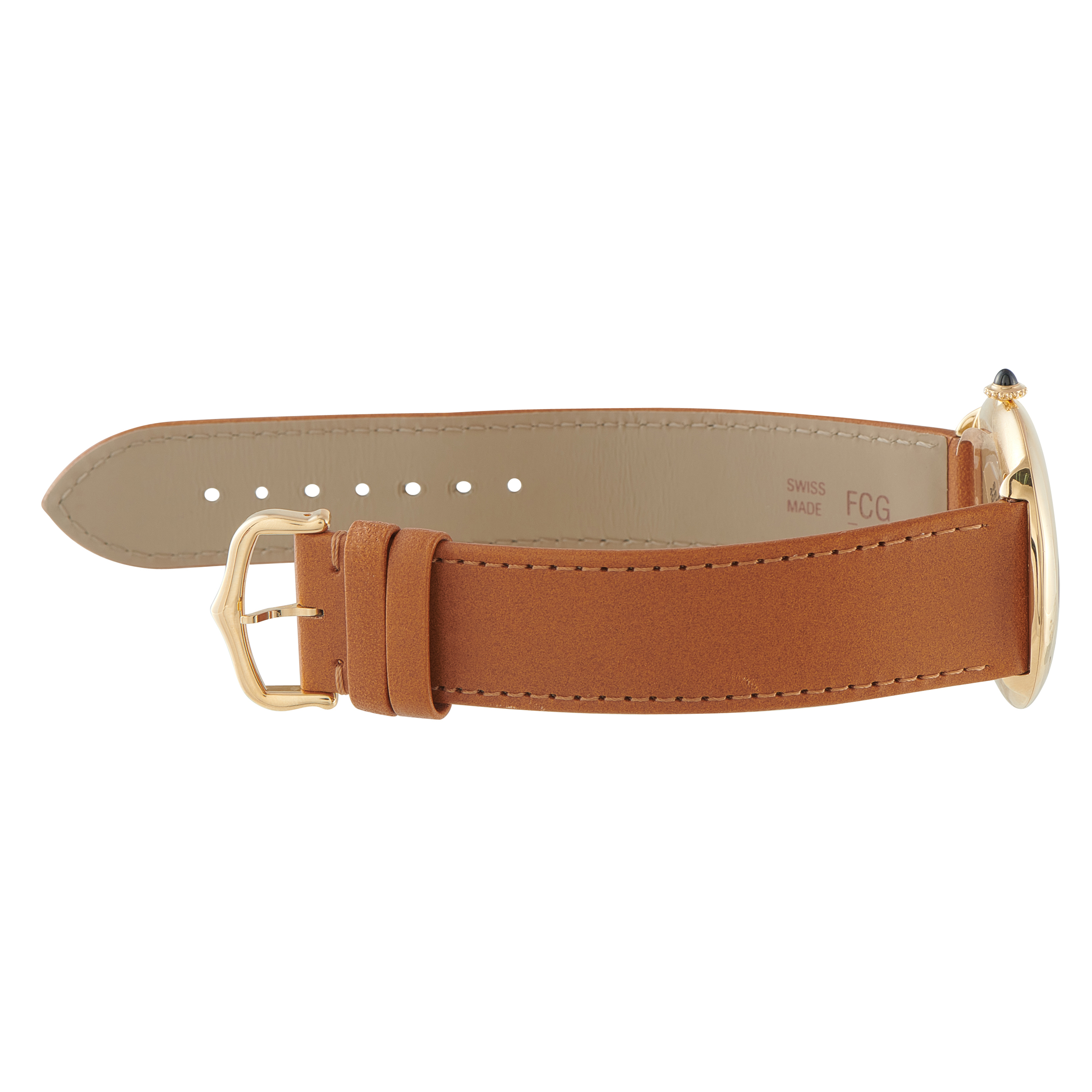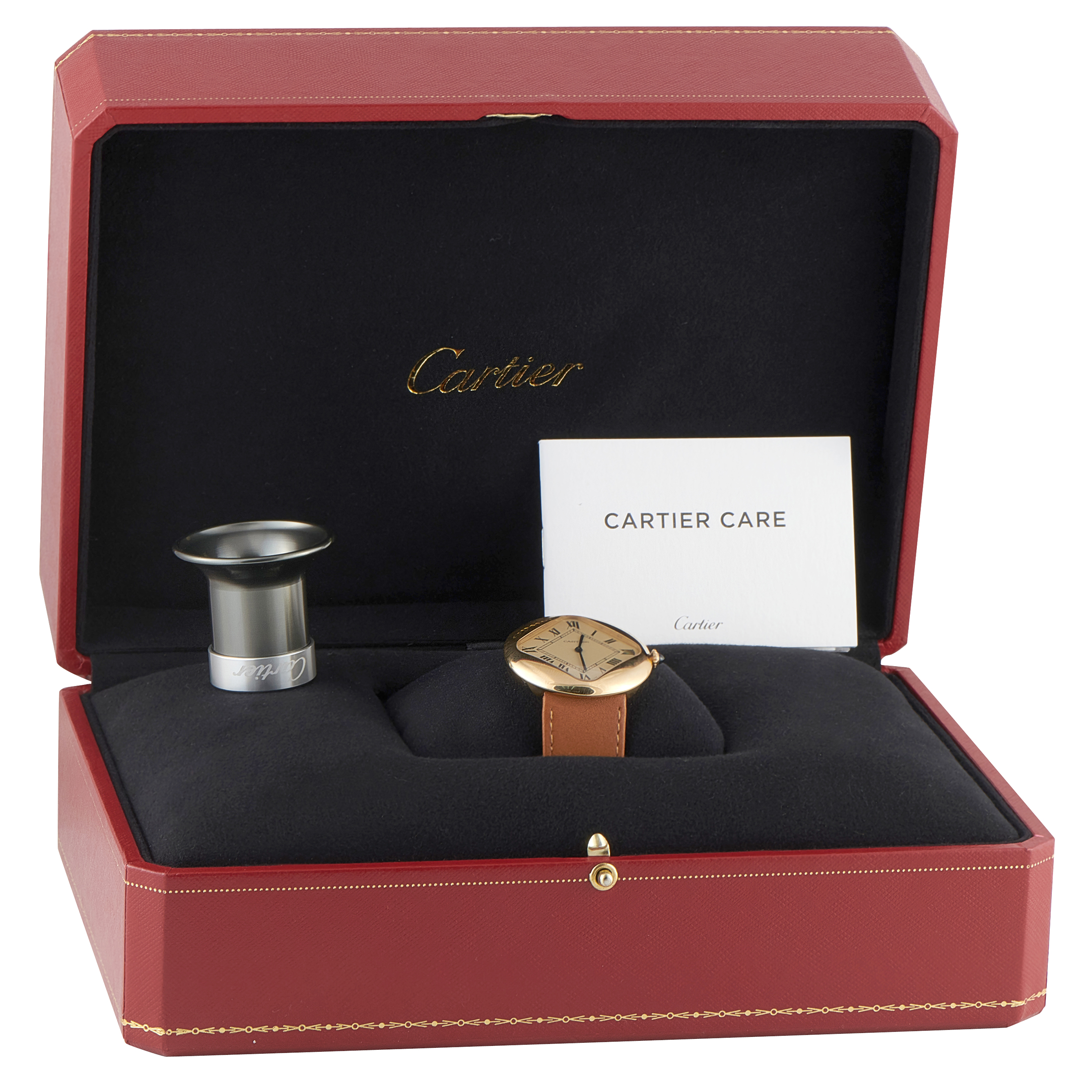 Papers, a loupe, and the manufacturer’s box accompany this pre-owned Cartier Pebble-Shaped 18k Yellow Gold Limited Edition Watch CRWGPB0003.