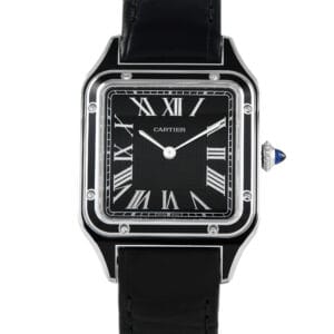 This is a pre-owned Cartier Santos-Dumont Large Model Watch WSSA0046. It comes with papers and the manufacturer’s box.
