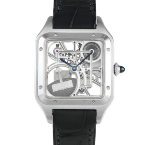 This is a pre-owned Cartier Santos-Dumont Skeleton Dial Micro-Rotor Watch WHSA0032. It comes with papers and the manufacturer’s box.