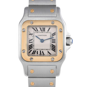 Measuring 24mm across, with blued steel hands on a time-only face, the two-toned Santos Galbée ladies’ watch is a remarkable example of Cartier’s expertise in producing refined and elegant timepieces. The watch offers a timeless style with its steel case, rounded square bezel in yellow gold, and steel bracelet with yellow gold screws. The dial features the brand’s signature railroad inner minute track and Roman numeral hour markers. This Swiss made timepiece is equipped with a quartz movement.