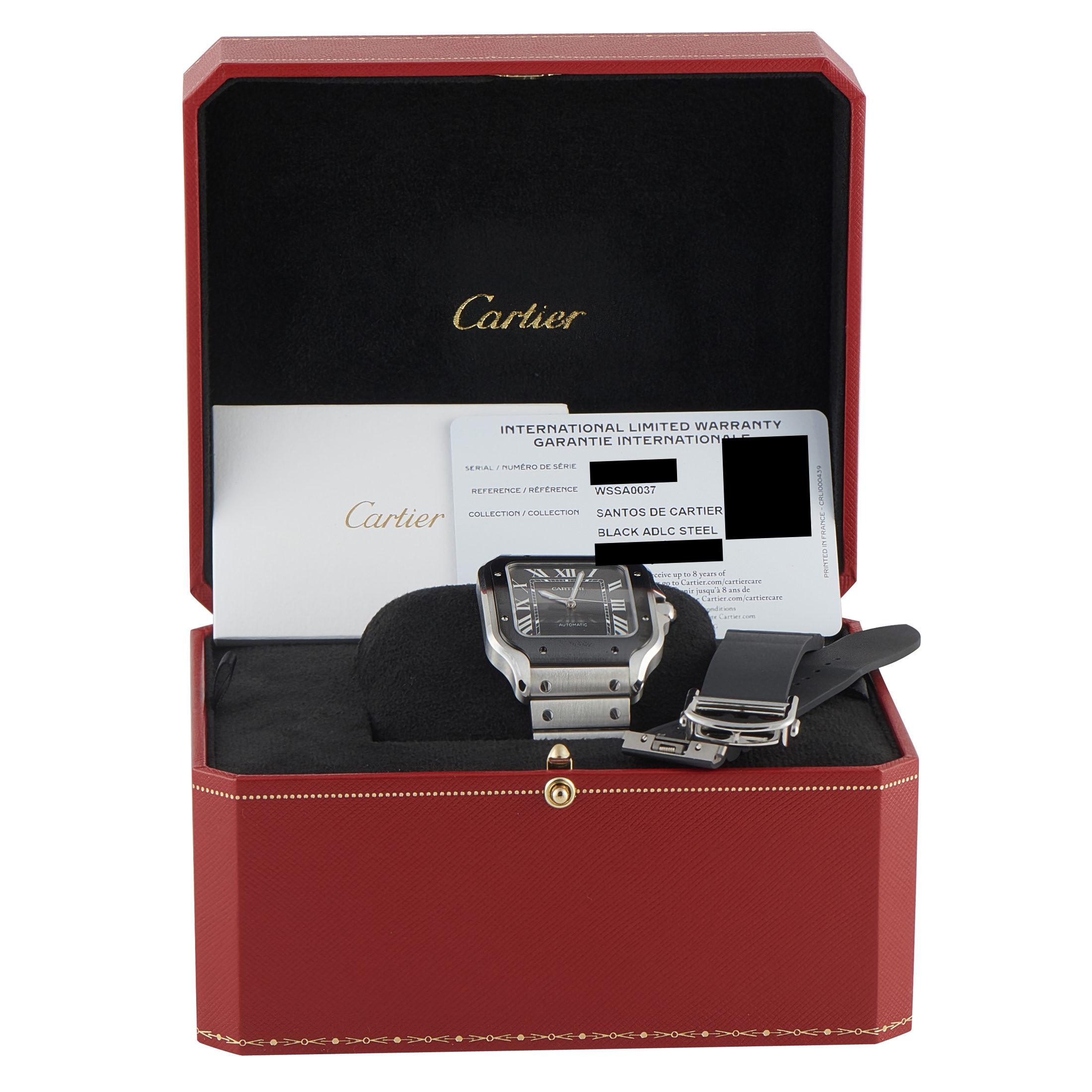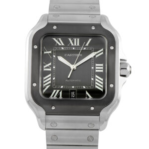 This is an unworn Cartier Santos Large ADLC Bezel Steel Watch WSSA0037. It includes papers, a secondary strap, and the manufacturer’s box.