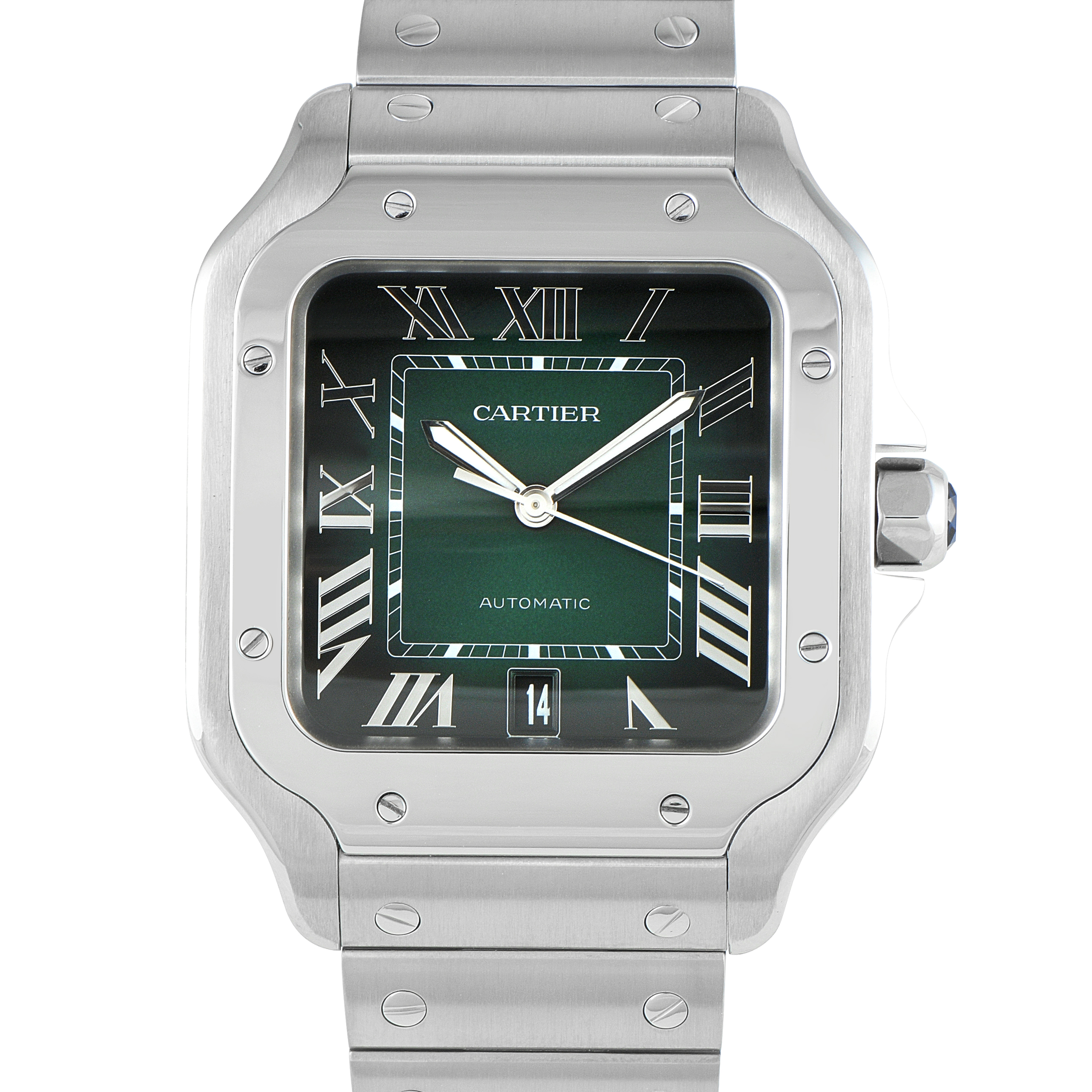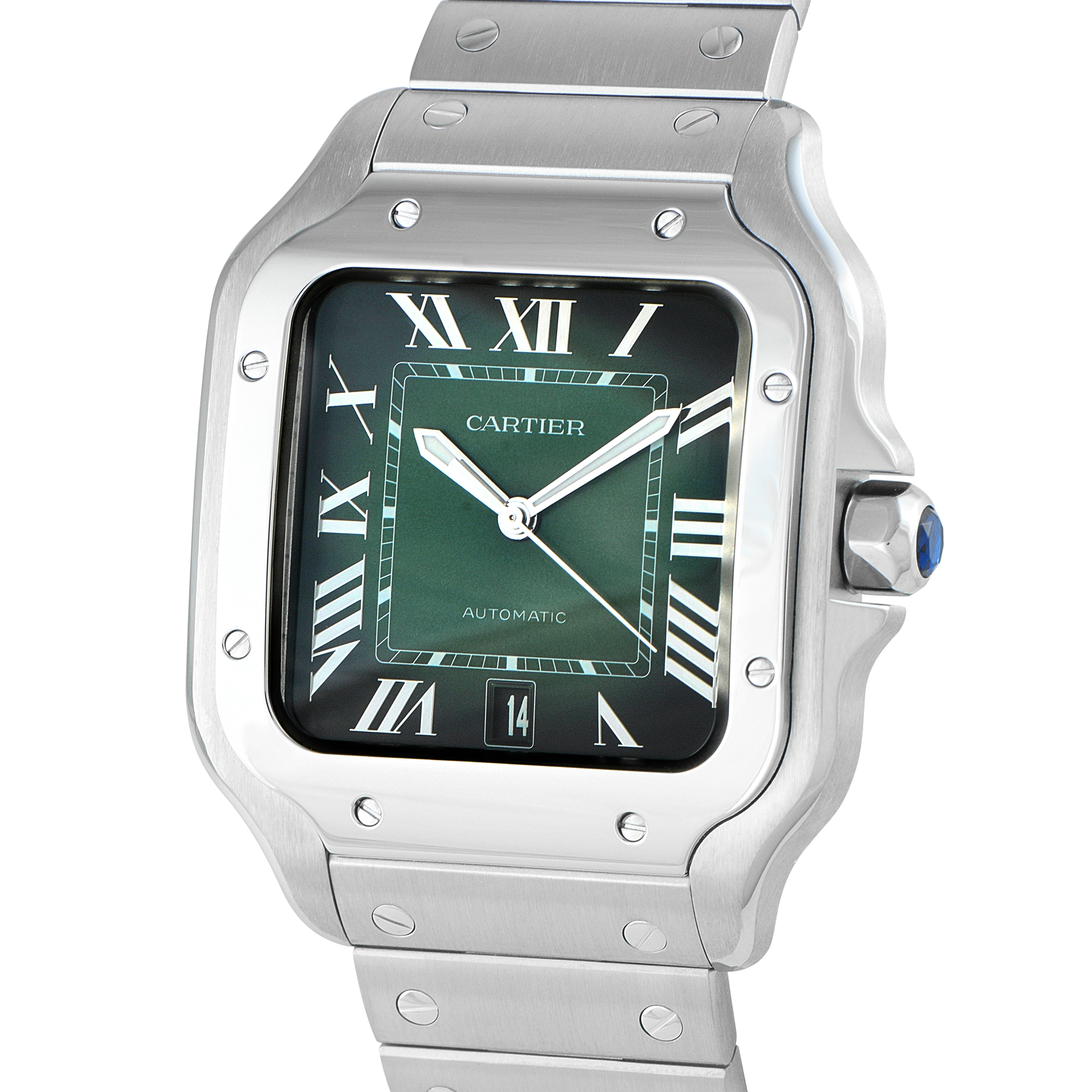 This is a pre-owned Cartier Santos Large Model Green Dial Steel Watch WSSA0062. It comes with papers, secondary straps, and the manufacturer’s box.