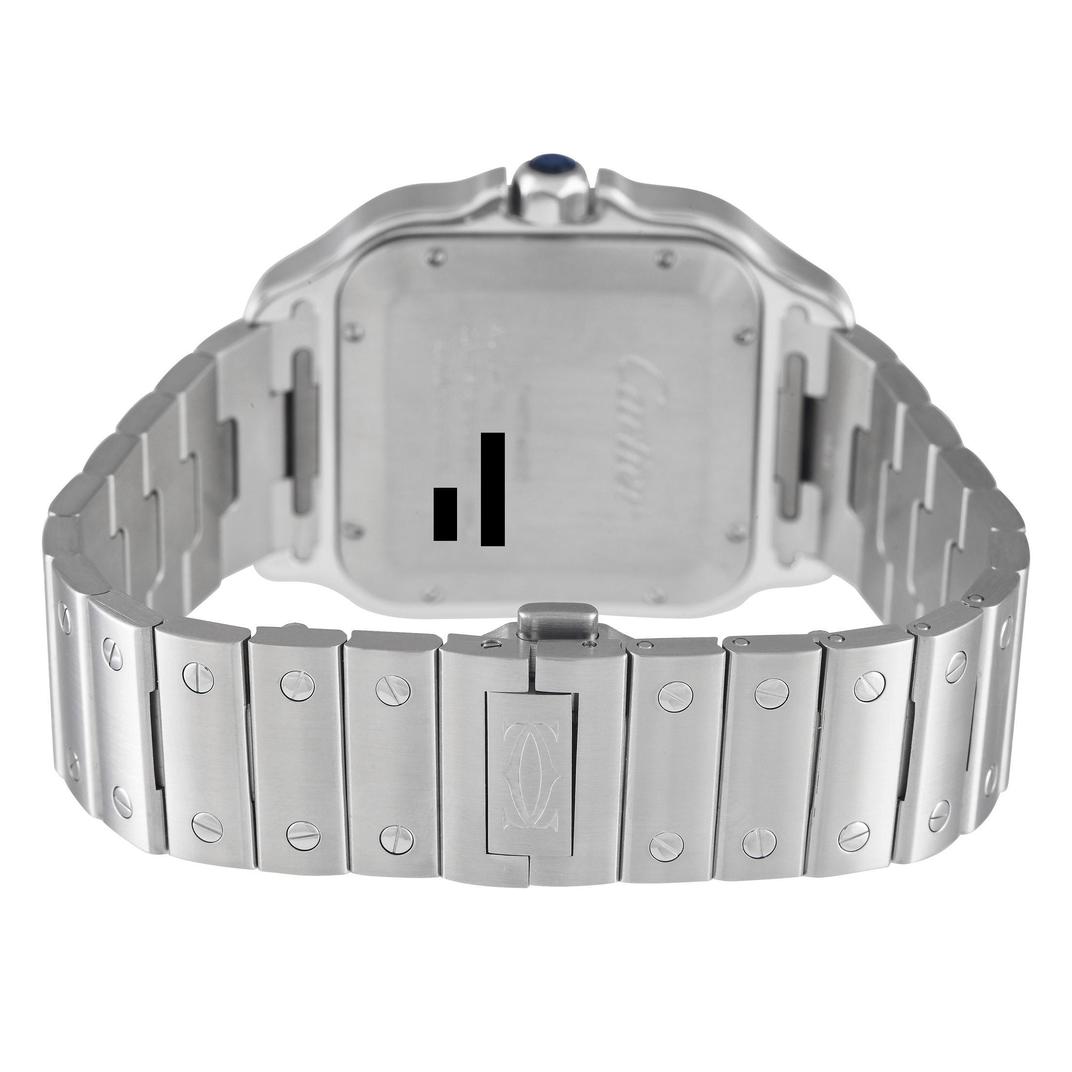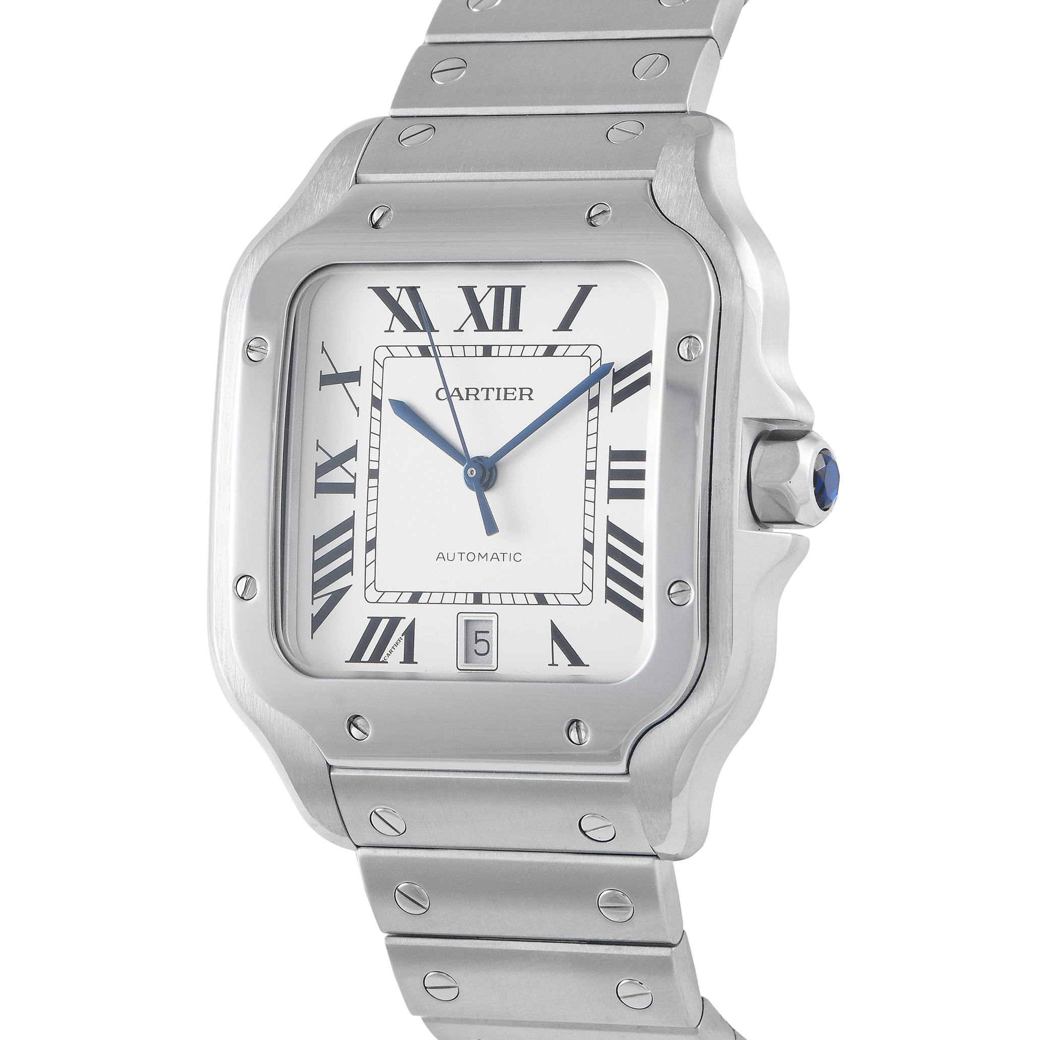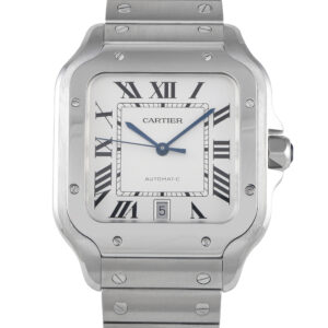 This pre-owned Cartier Santos Large Model Watch WSSA0018 is accompanied by papers, extra strap and clasp, bracelet changing tool, and the manufacturer’s box.