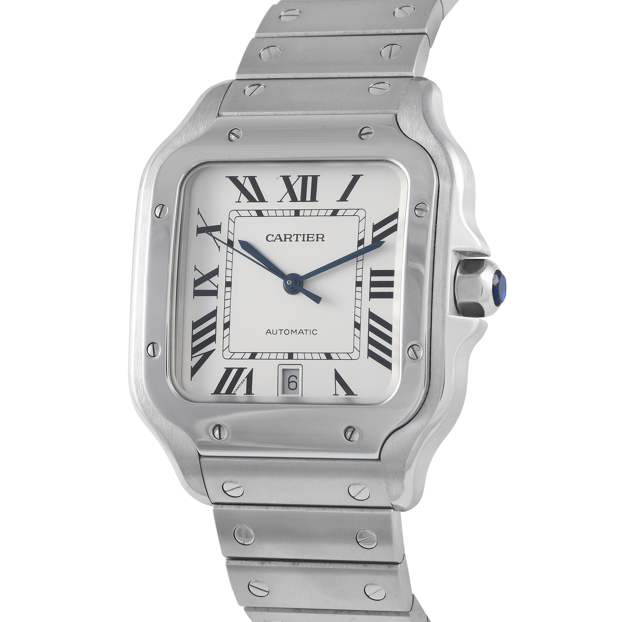 This pre-owned Cartier Santos Large Model Watch WSSA0018 is accompanied by papers, extra straps, bracelet changing tool, and the manufacturer’s box.