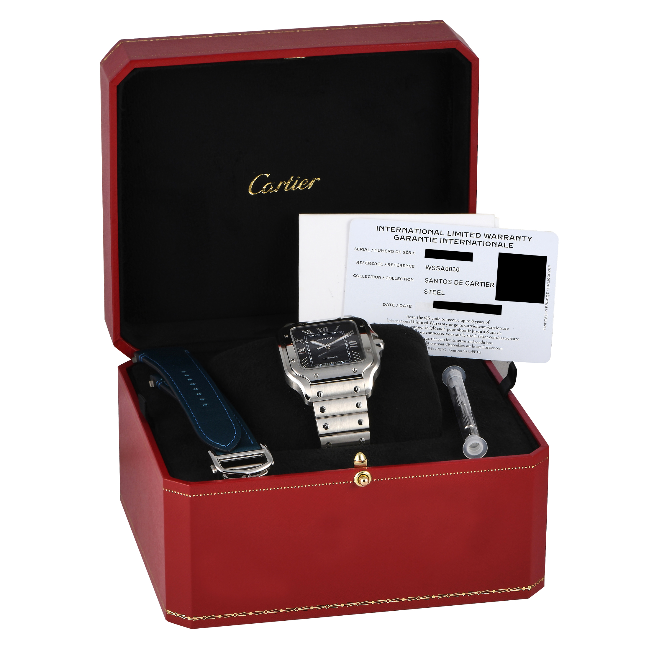 This pre-owned Cartier Santos Large Model Blue Dial Watch WSSA0030 comes with papers, extra strap, and the manufacturer’s box.