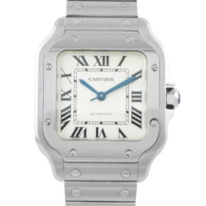 Offered pre-owned, this Cartier Santos Medium Steel Watch WSSA0029 comes with papers, extra leather strap, and the manufacturer’s box.