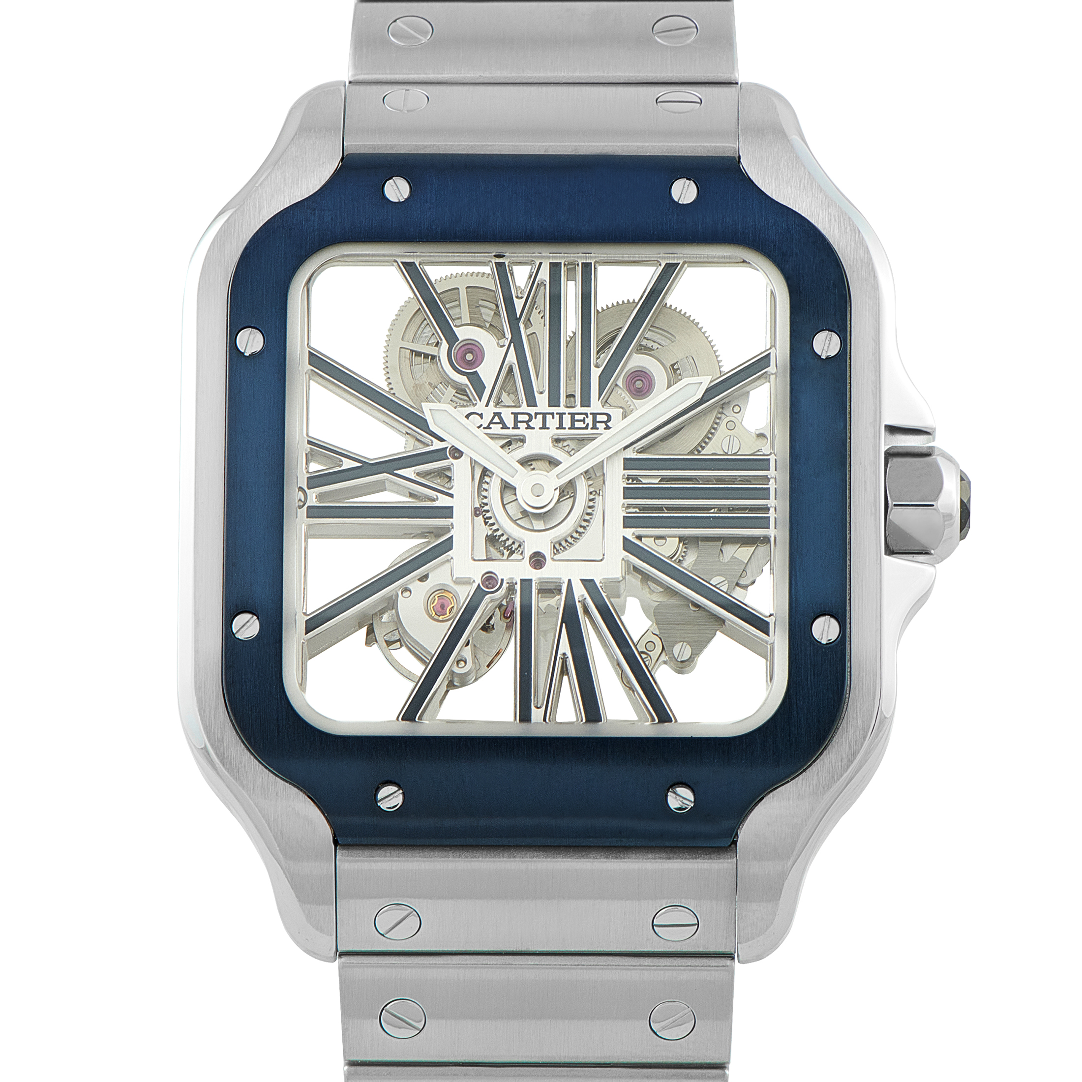 The iconic Santos de Cartier gets a contemporary twist in this ref. WHSA0026. Its stainless steel case is set with a brushed blue bezel for an architectural edge. The skeletonized dial showcases blued Roman numerals that form the bridges of the movement. Luminous hands float above the openworked display, offering clarity without distraction. The watch is driven by the manual-winding Caliber 9611 MC, with fine finishing revealed through the sapphire case back.