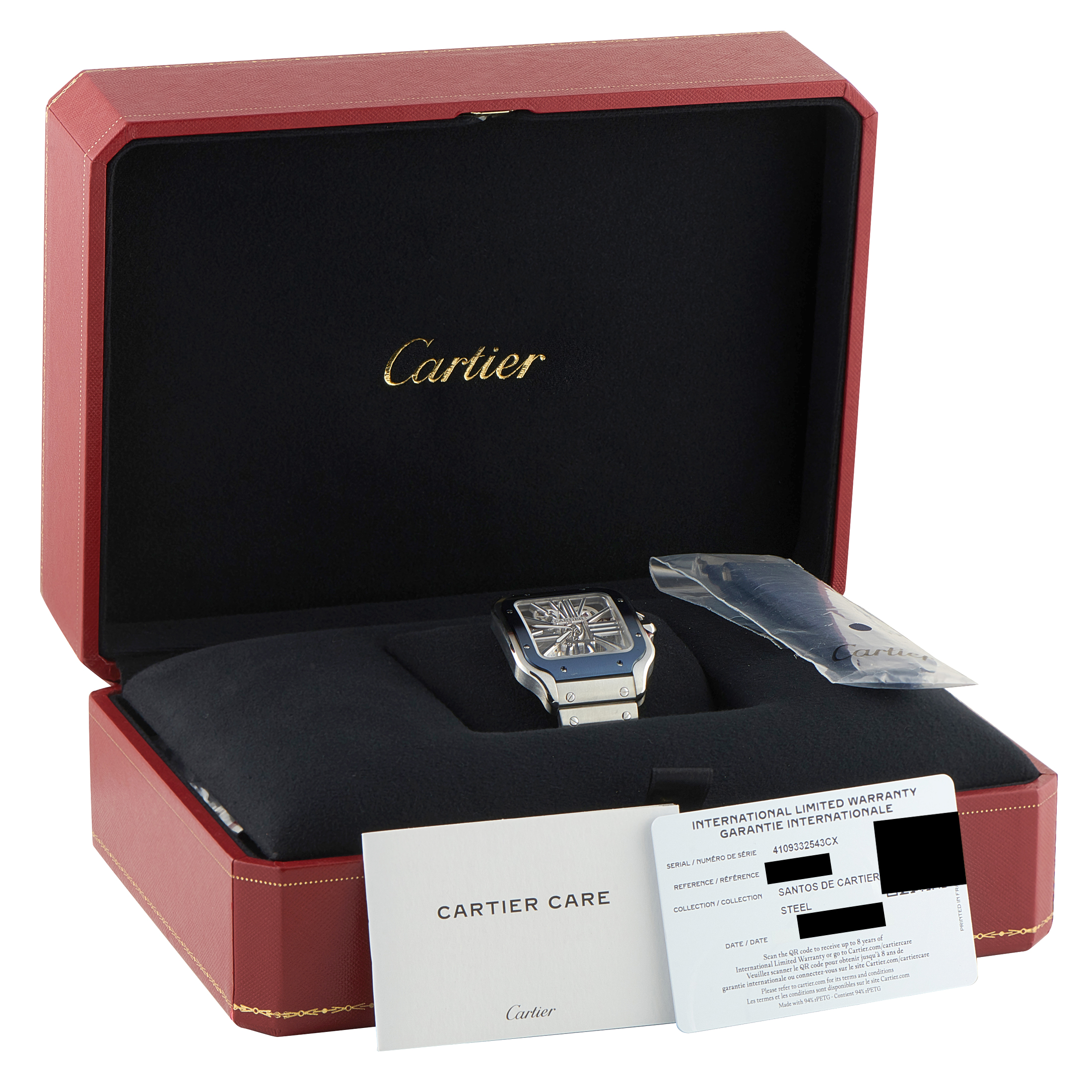 This is a pre-owned Cartier Santos Skeleton Steel Watch WHSA0026. It comes complete with papers, an extra rubber strap, and the manufacturer’s box.