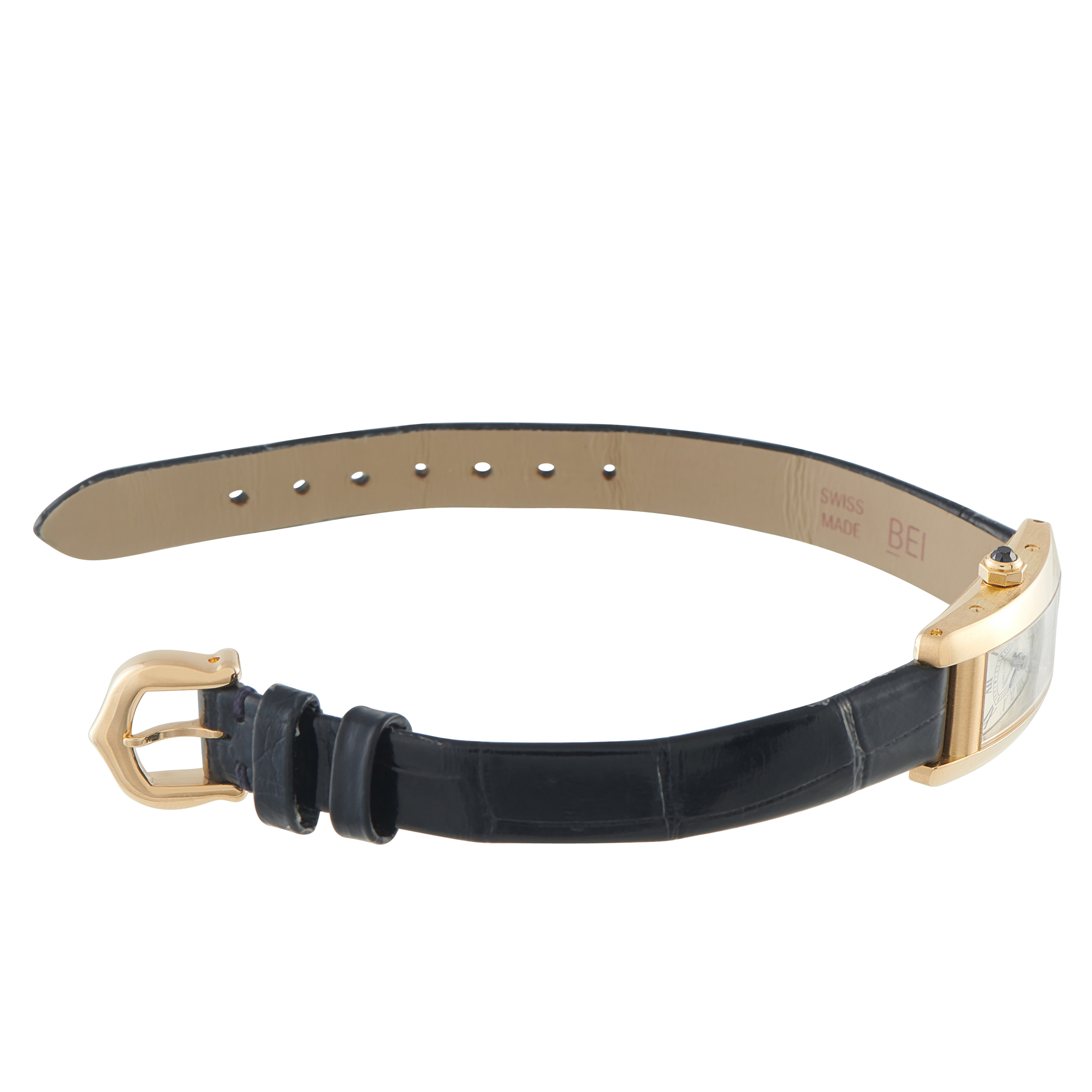 The Tank Américaine Mini is a pure dress watch, designed to be set once and relied on without thought. It uses a high-autonomy quartz movement with a high-efficiency motor. At just 6.5 mm thick, its rectangular and curved 18K yellow gold case sits slim and fluid on the wrist. The silvered sunray dial carries Cartier’s blued-steel sword hands, crisp against the curved profile, while a faceted sapphire crowns the case. Finished on a deep navy alligator strap, the contrast is sharp and deliberate, honoring Cartier’s long legacy of effortless Parisian style.