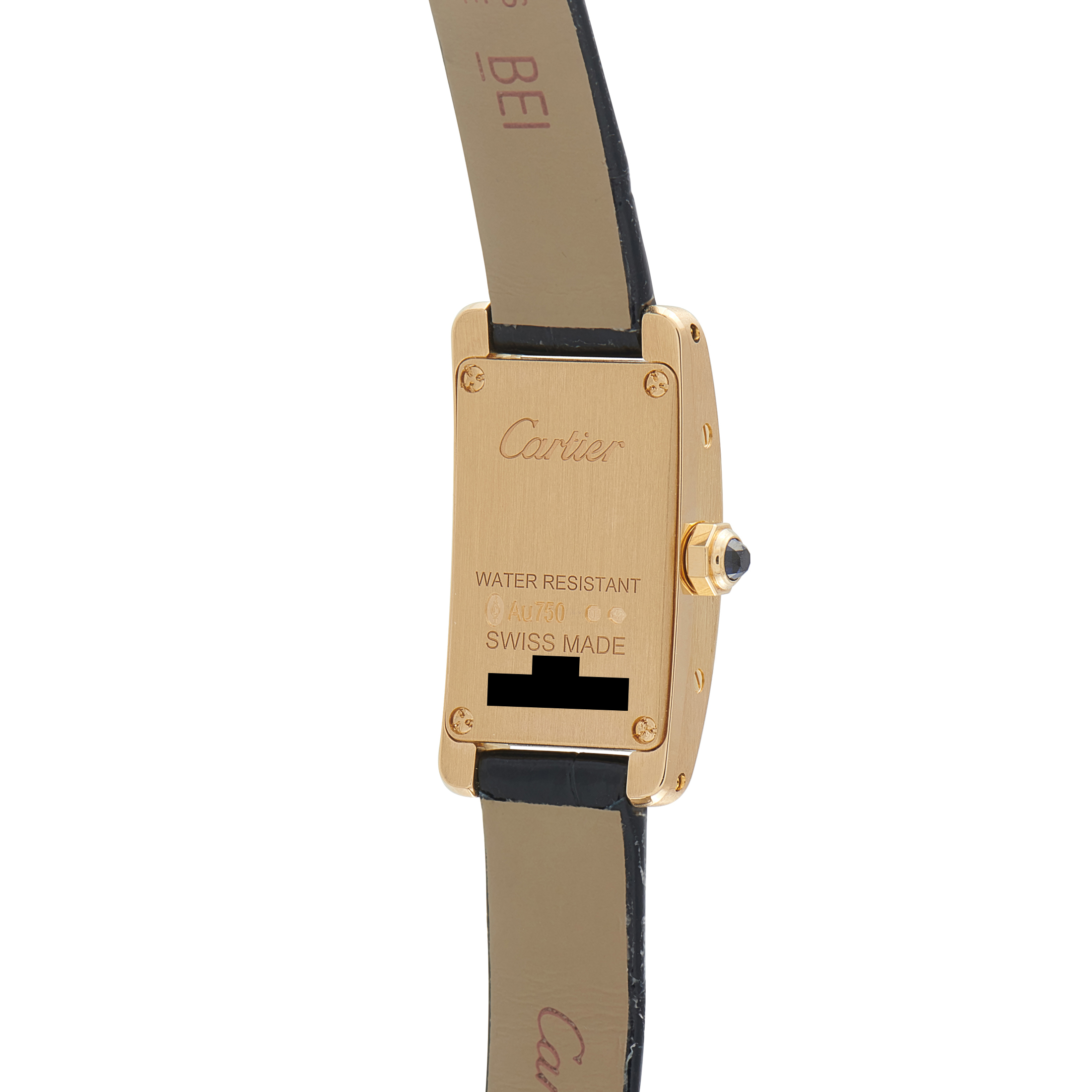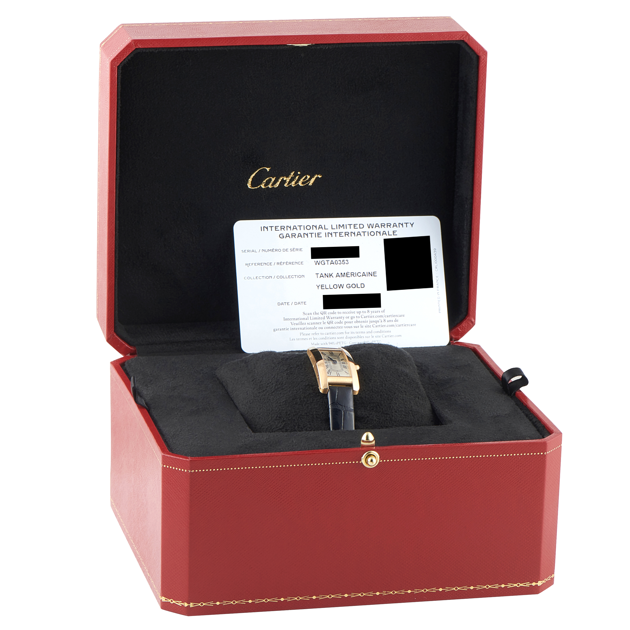 This pre-owned Cartier Tank Américaine Mini 18K Yellow Gold Ladies Watch WGTA0353 comes with papers and the manufacturer’s box.