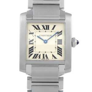 A gift box accompanies this pre-owned Cartier Tank Française Mid-Size Steel Watch 3751.