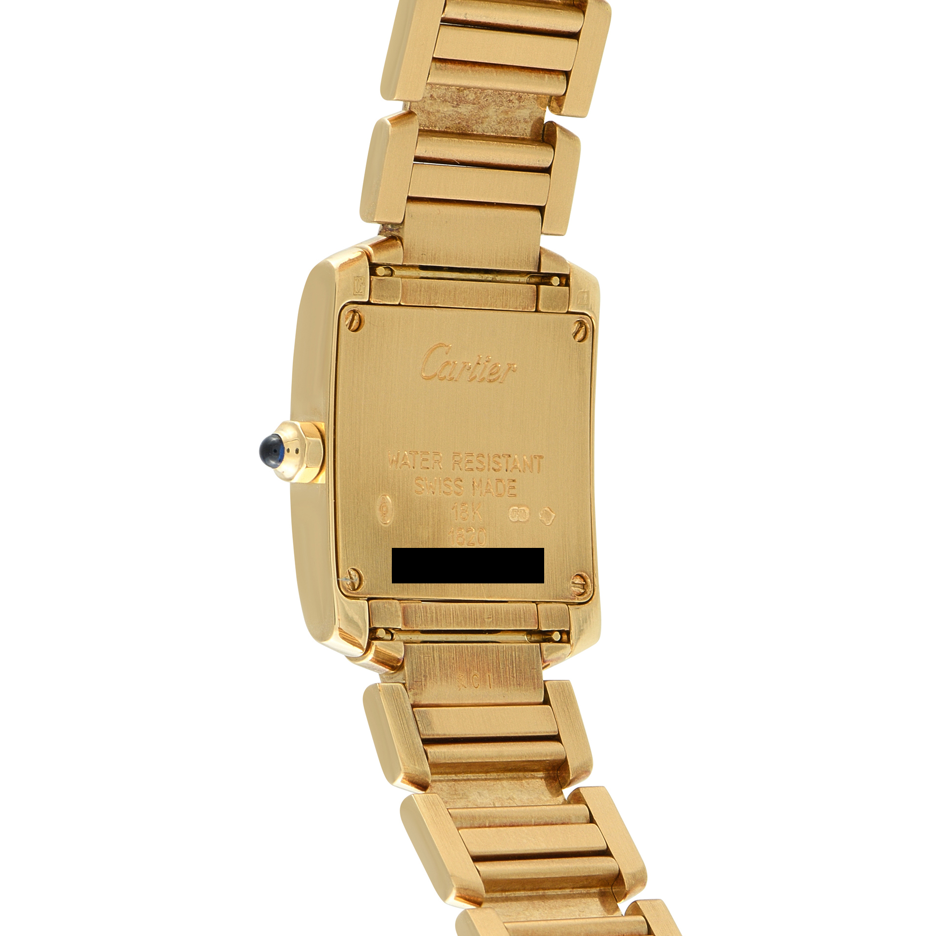 Discreet but unmistakably luxurious, the Tank Française ref. w50002n2 presents Cartier at its most classic. The watch is rendered entirely in 18K yellow gold, from its 20 × 25 mm case that frames a silvered dial to its integrated bracelet with a hidden deployant clasp. A blue cabochon marks the octagonal crown, while the dial is detailed with Cartier’s signature Roman numerals and blued steel hands in sword shape. Powered by the quartz caliber 057, it delivers precise hours and minutes in a watch designed for elegant yet effortless daily wear.