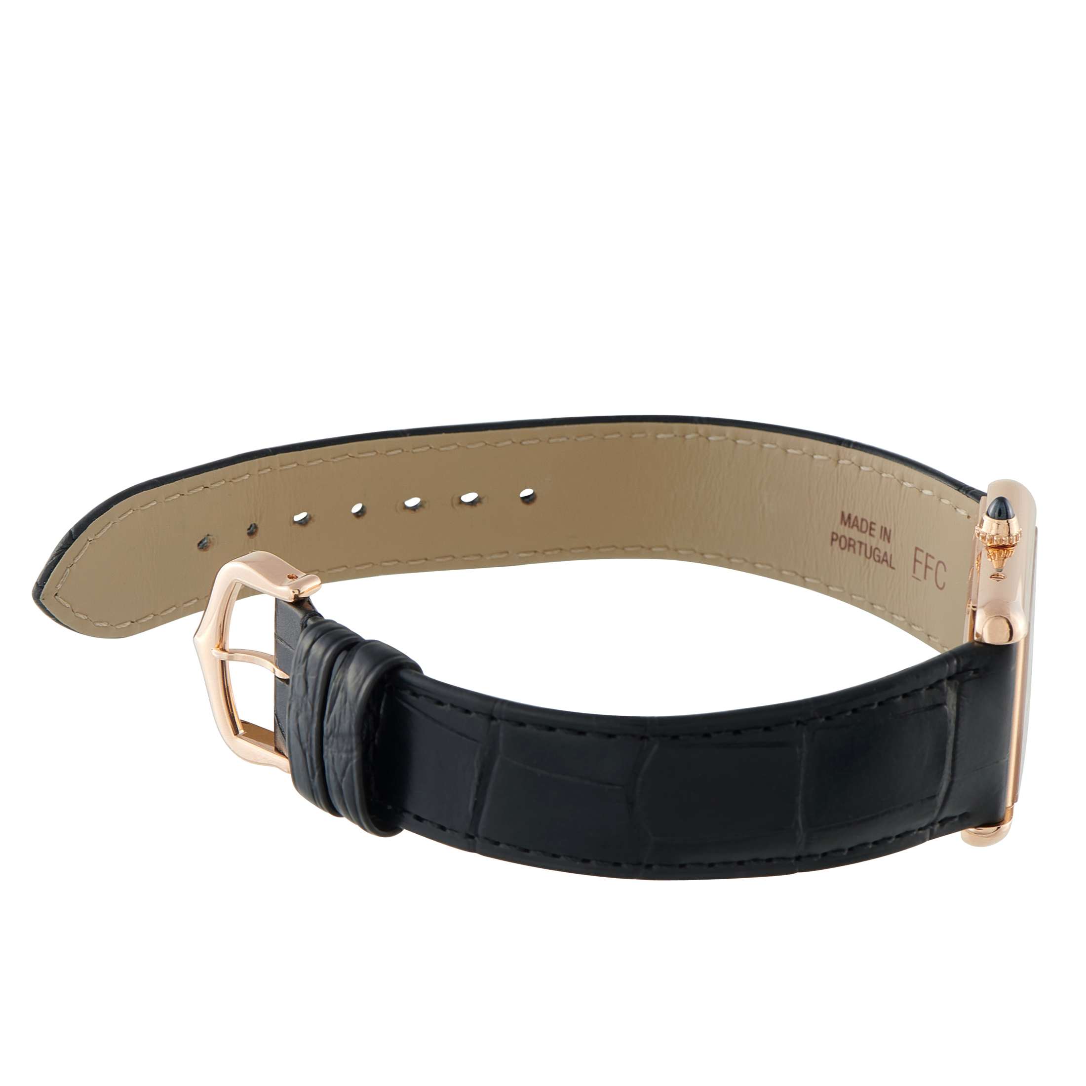 The Tank Louis Cartier in rose gold is the configuration purists return to. No date, no complications. Just the original codes set in place in 1917: the rectangular case, parallel brancards, Roman numerals, blued steel hands, and railway minute track. The case measures 33.7mm by 25.5mm, with a remarkably slim profile of only 6.6mm. It houses the Caliber 1917 MC, a manual-winding movement that offers a 38-hour power reserve.