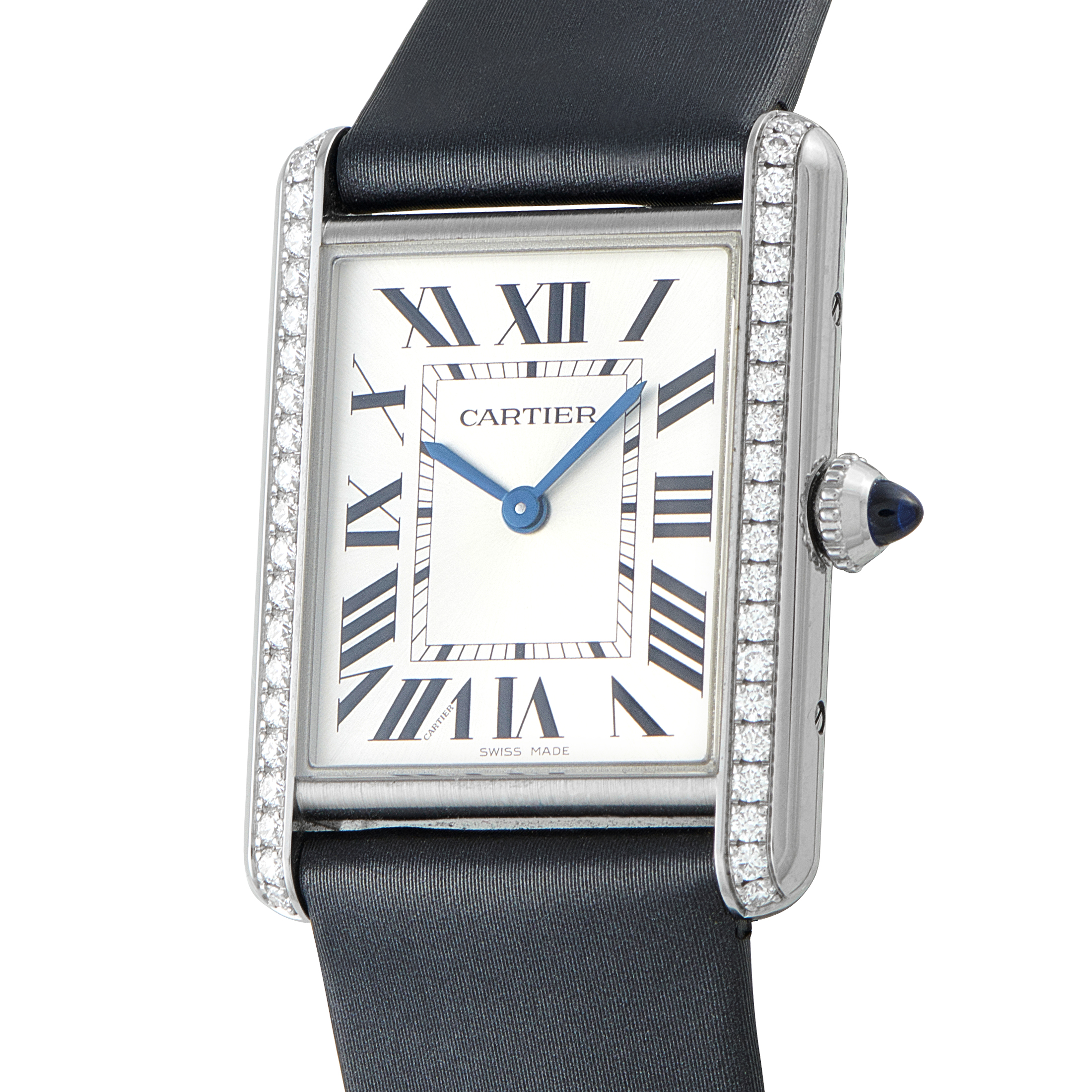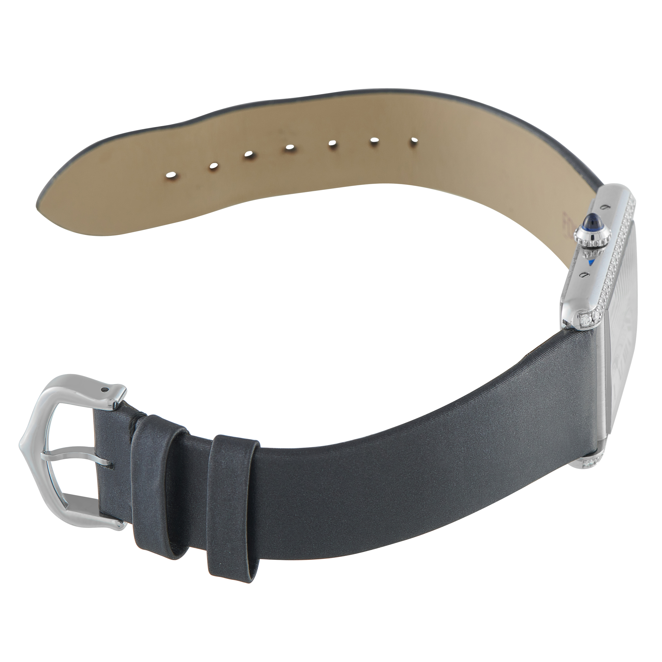 A sophisticated and versatile rectangular watch, this large model Tank Must exemplifies Cartier’s mastery of understated luxury. Its 33.7 x 25.5 mm stainless steel case is set with 42 brilliant-cut diamonds, providing a luxurious frame for the uncluttered silvered dial. Signature blued steel hands and Roman numeral hour markers complete the classic watch face. Underneath is a reliable high-autonomy quartz movement, ensuring precision and ease of wear.