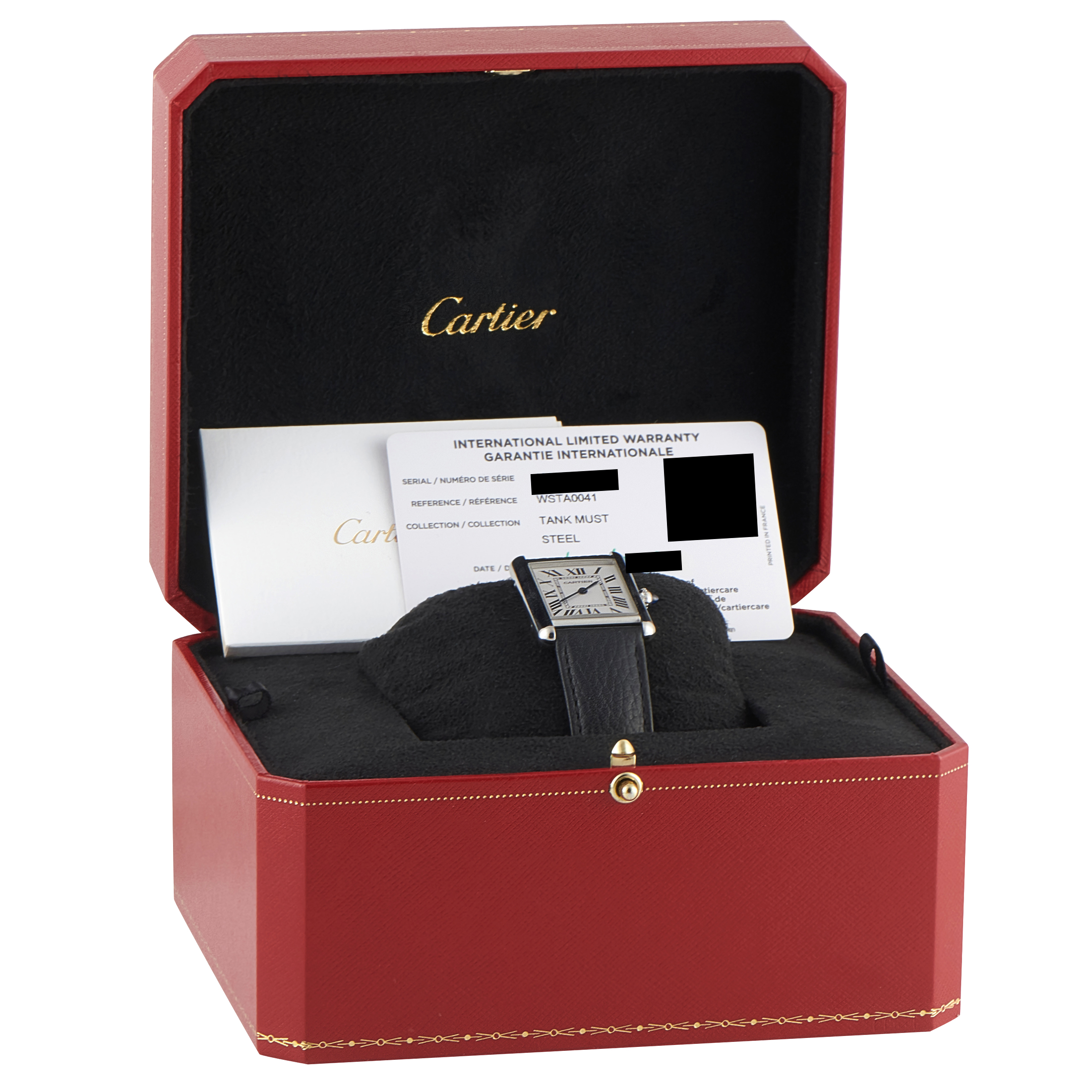 This is a pre-owned Cartier Tank Must Large Model Steel Watch WSTA0041. It comes complete with papers and the manufacturer’s box.