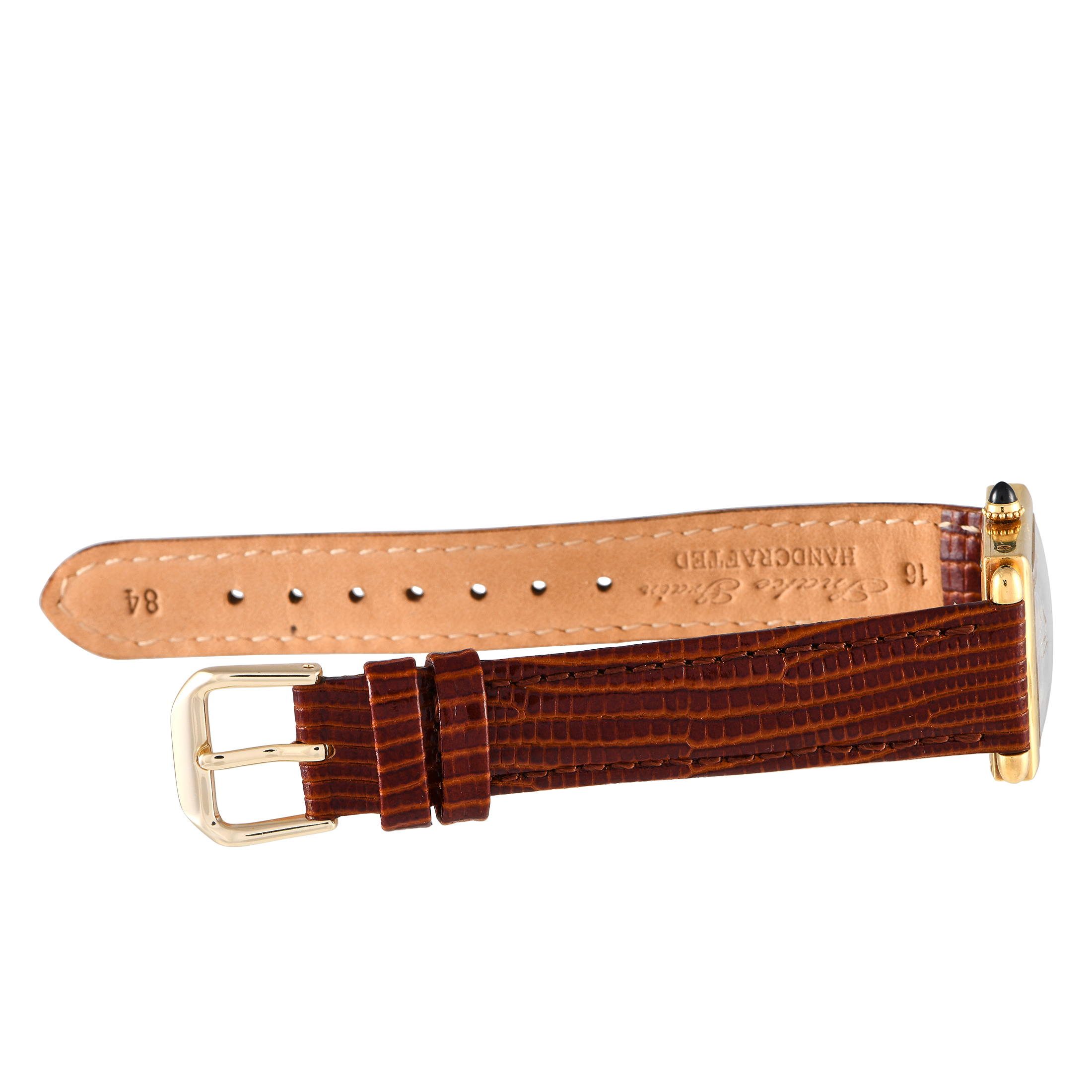 The Cartier Tank Obus was released in 1929. It bears a distinct square-shaped case measuring 24mm x 24mm. The polished 18K yellow gold case features a solid caseback, rounded bullet lugs, and a crown set with a sapphire cabochon. The silvered dial has blued steel hour and minute hands, black Roman numeral hour markers with the Cartier secret signature at 7, and an inner minute rail track. This quartz watch is fitted with a brown leather strap with a yellow gold tang buckle.