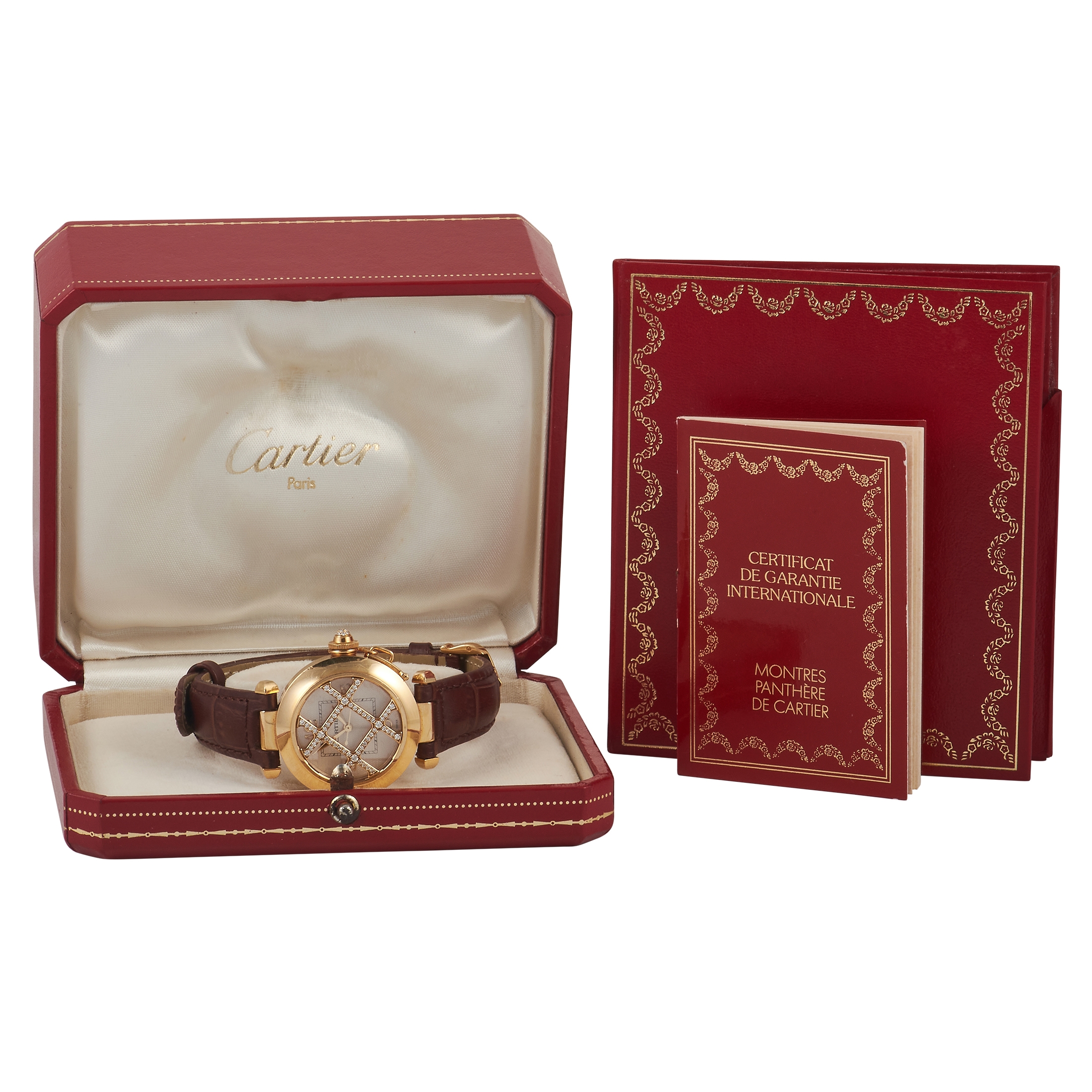 Offered in pre-owned condition, this Cartier Pasha de Cartier 18K Yellow Gold Diamond Grille Watch 2399 comes complete with papers and the manufacturer’s box.