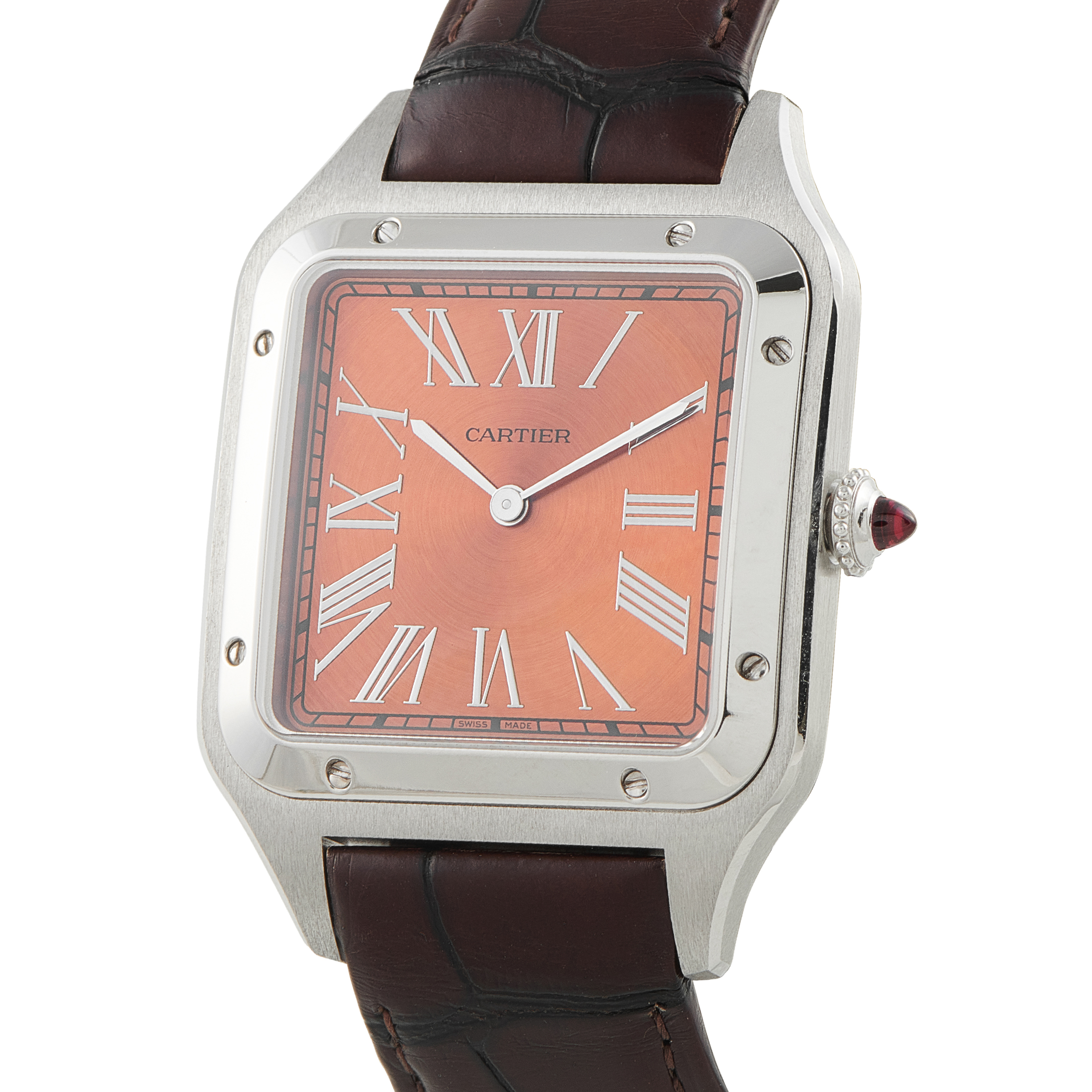 This unworn Cartier Santos-Dumont XL Copper Dial Platinum Watch WGSA0113 comes with papers and a gift box.